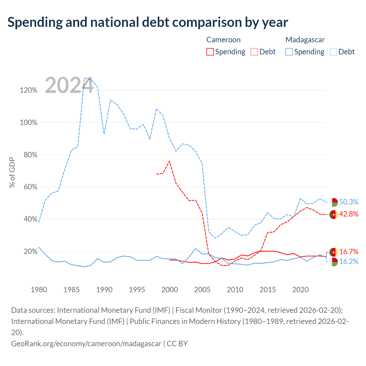 Cameroon has $22.8B in government debt (42.8% of GDP), compared to $8.77B (50.3% of GDP) in Madagascar.