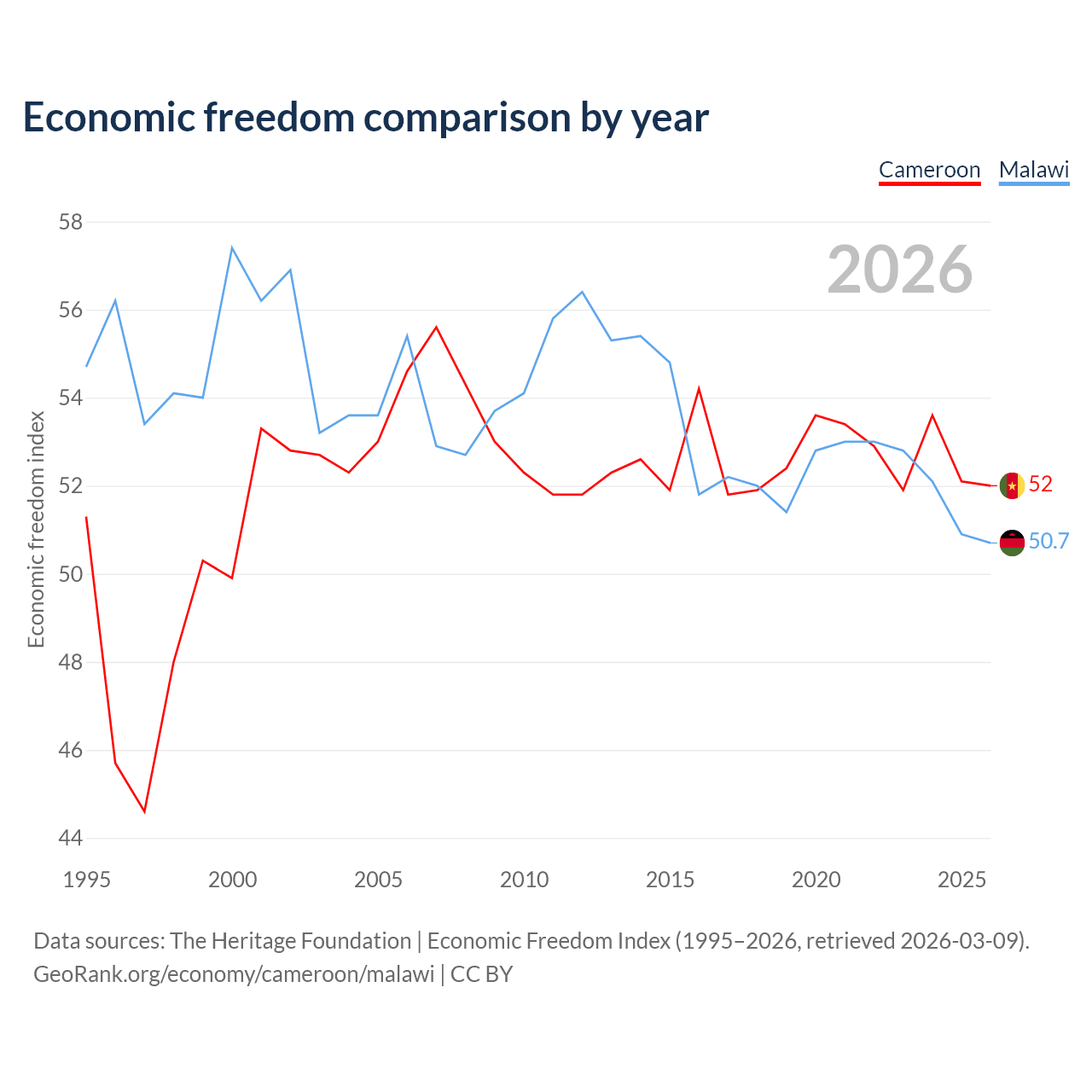 The Economic Freedom Index for Cameroon is 52, ranking 151/197, compared to 50.7 for Malawi, ranking 159/197. The chart above displays a comparison of annual changes in economic freedom indexes.