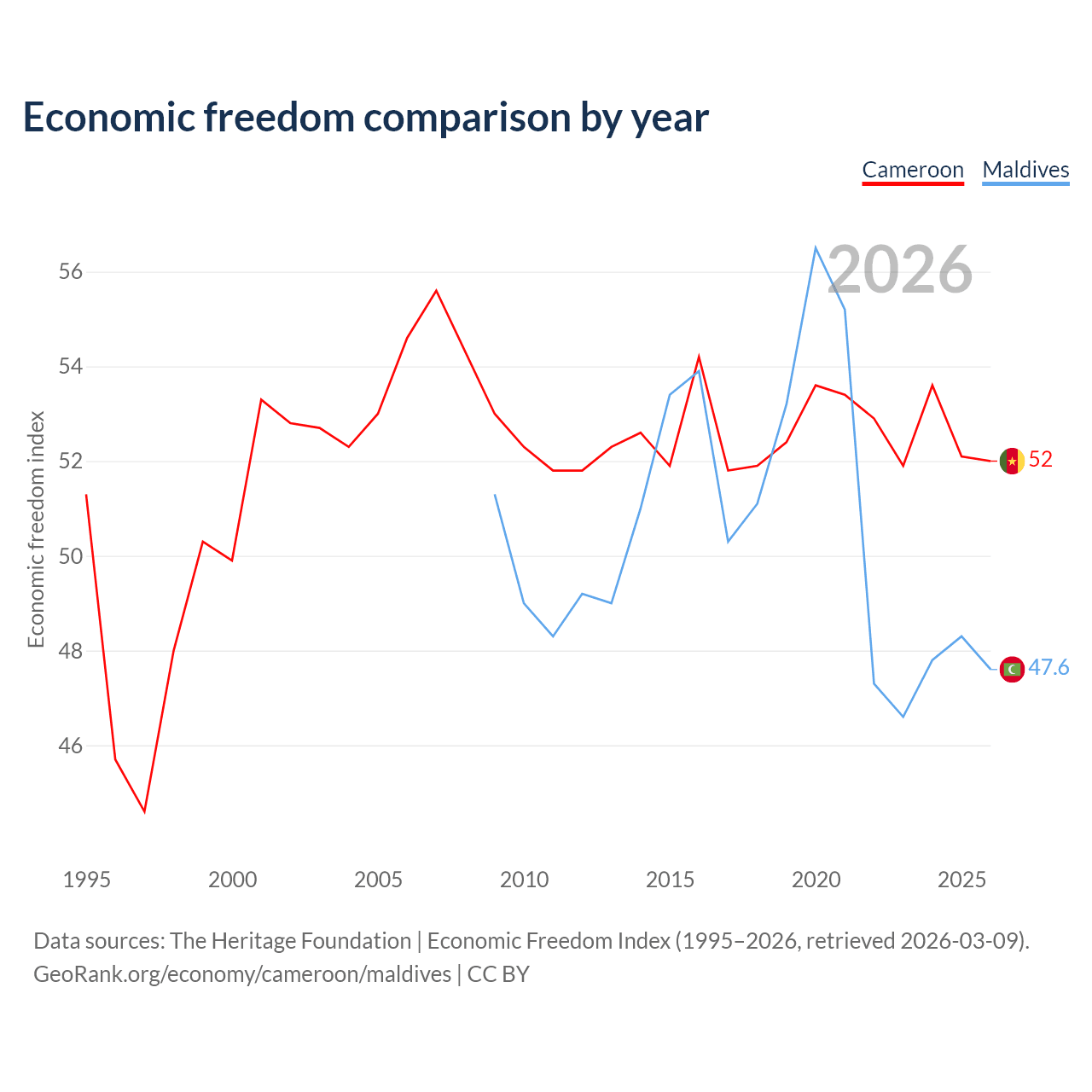 The Economic Freedom Index for Cameroon is 52, ranking 151/197, compared to 47.6 for Maldives, ranking 174/197. The chart above displays a comparison of annual changes in economic freedom indexes.