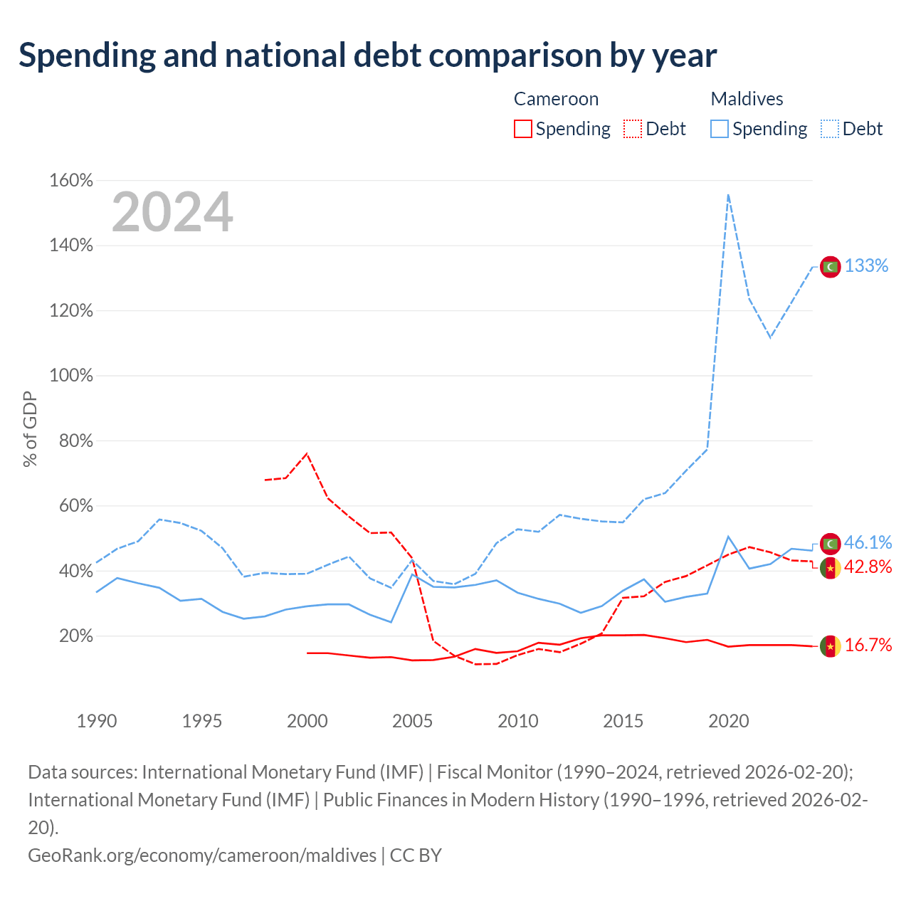 Cameroon has $22.8B in government debt (42.8% of GDP), compared to $9.41B (133.3% of GDP) in Maldives.