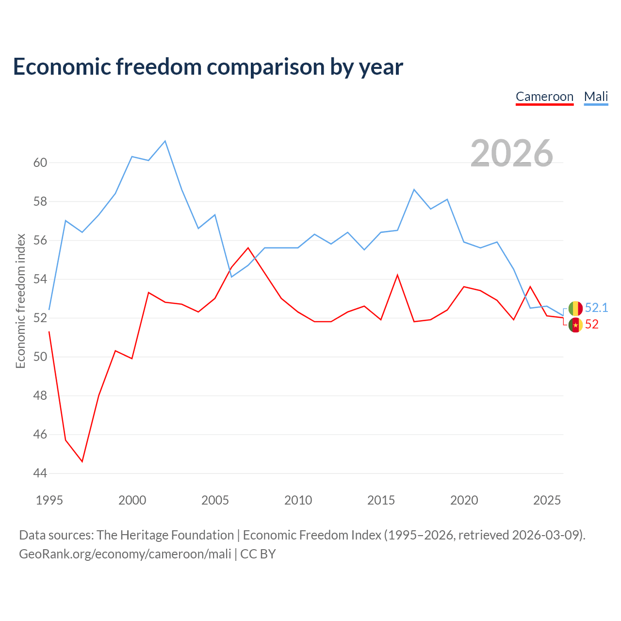 The Economic Freedom Index for Cameroon is 52, ranking 151/197, compared to 52.1 for Mali, ranking 150/197. The chart above displays a comparison of annual changes in economic freedom indexes.