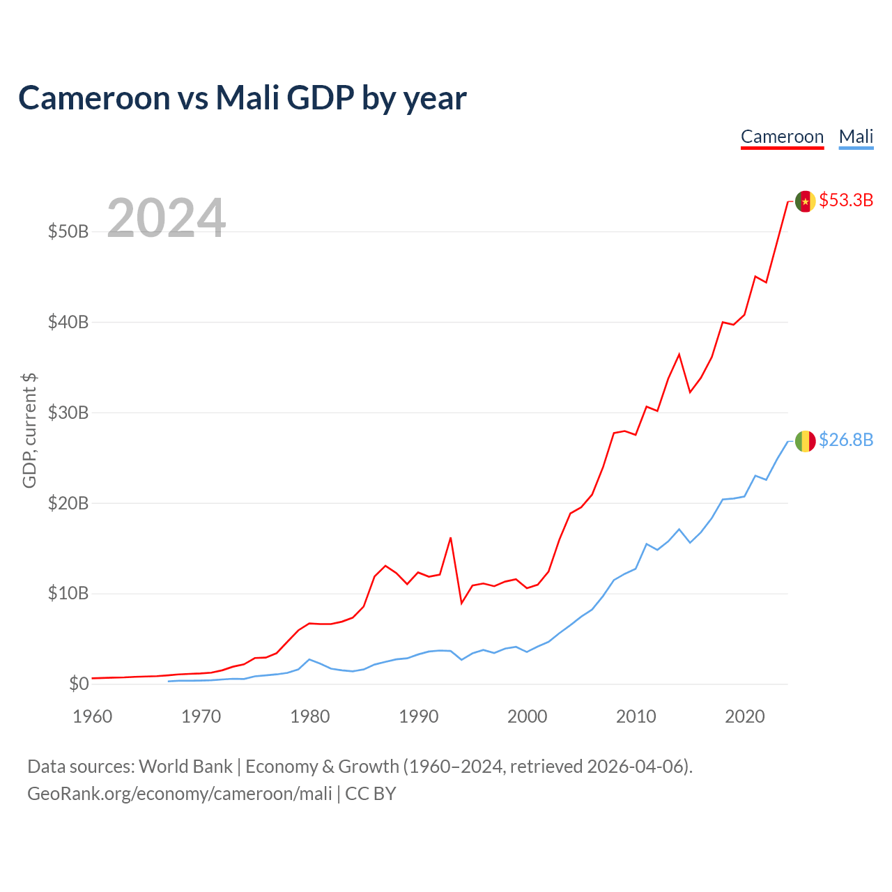 Cameroon has a GDP of $53.3B compared to $26.8B for Mali, ranking 91/197 and 113/197 by economy size, respectively.