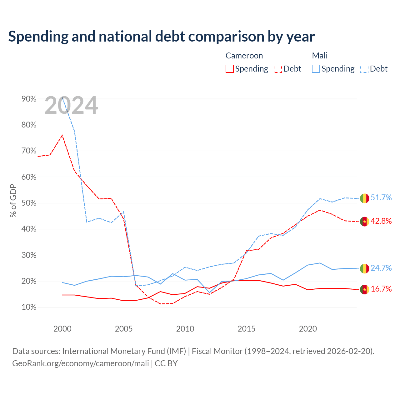 Cameroon has $22.8B in government debt (42.8% of GDP), compared to $13.9B (51.7% of GDP) in Mali.