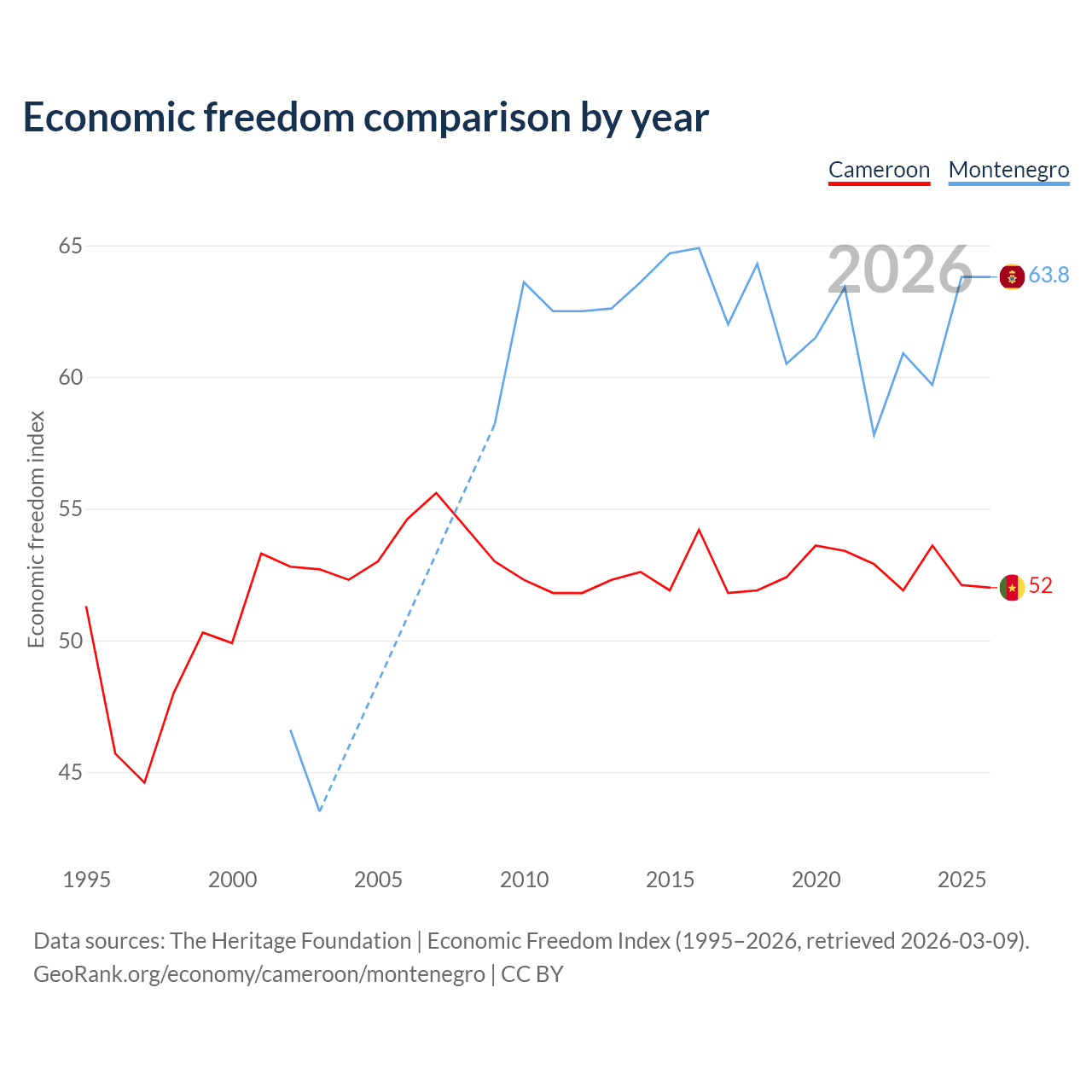 The Economic Freedom Index for Cameroon is 52, ranking 151/197, compared to 63.8 for Montenegro, ranking 78/197. The chart above displays a comparison of annual changes in economic freedom indexes.