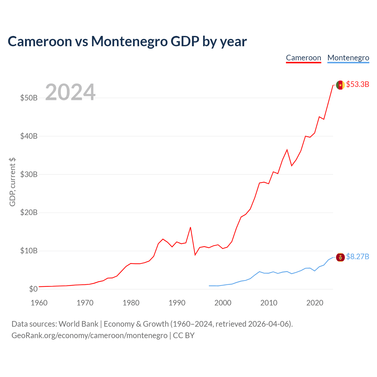 Cameroon has a GDP of $53.3B compared to $8.27B for Montenegro, ranking 91/197 and 155/197 by economy size, respectively.