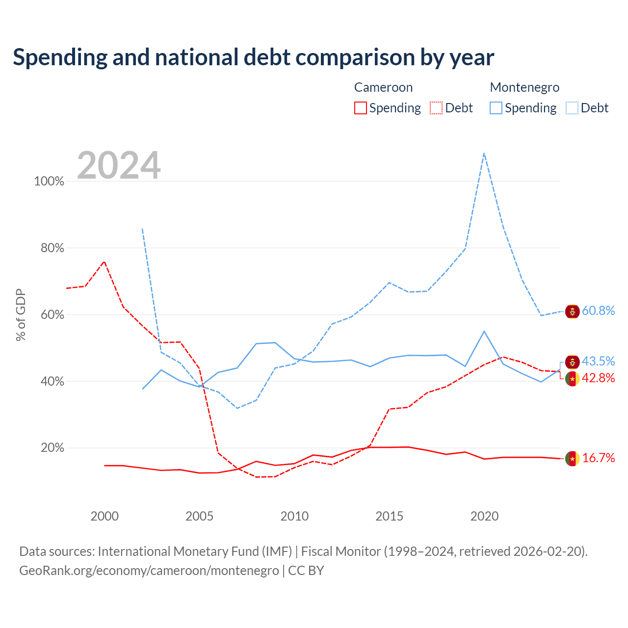 Cameroon has $22.8B in government debt (42.8% of GDP), compared to $5.02B (60.8% of GDP) in Montenegro.