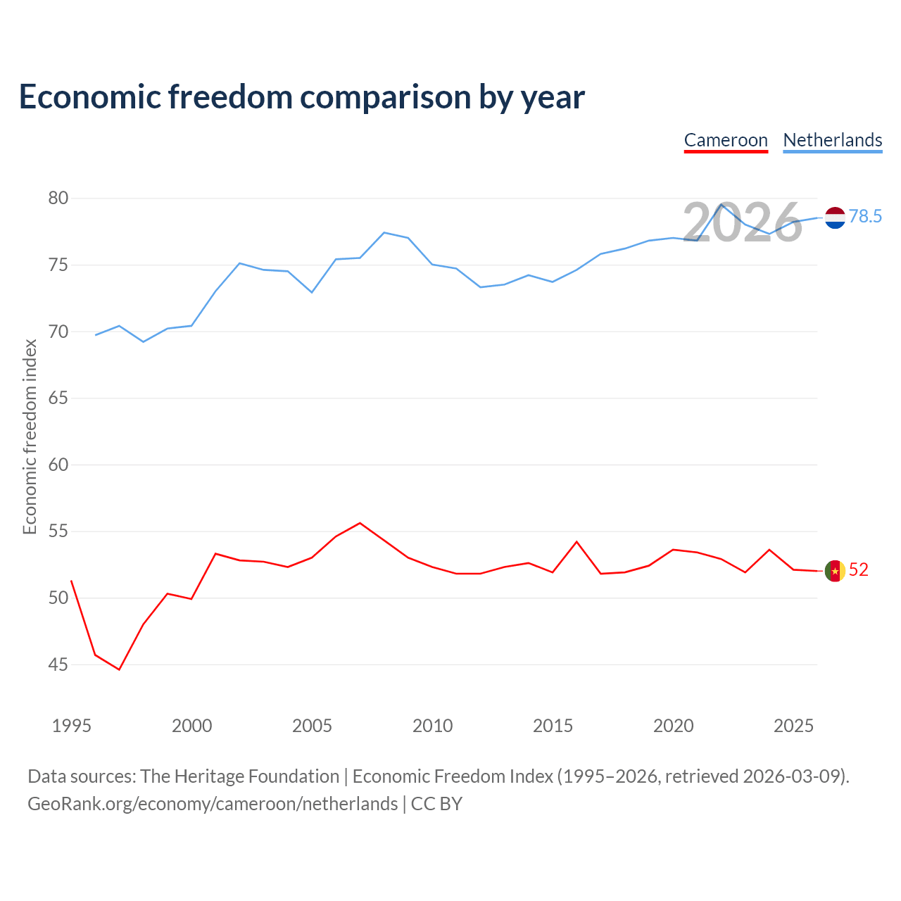 The Economic Freedom Index for Cameroon is 52, ranking 151/197, compared to 78.5 for the Netherlands, ranking 11/197. The chart above displays a comparison of annual changes in economic freedom indexes.