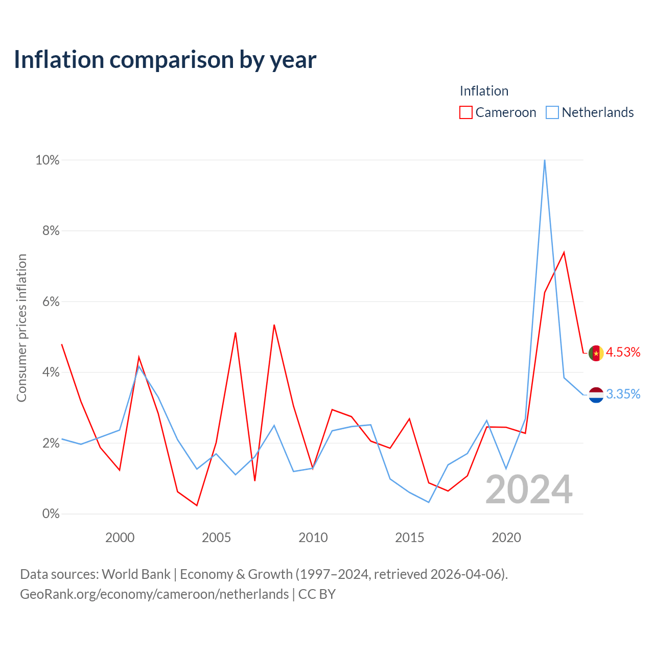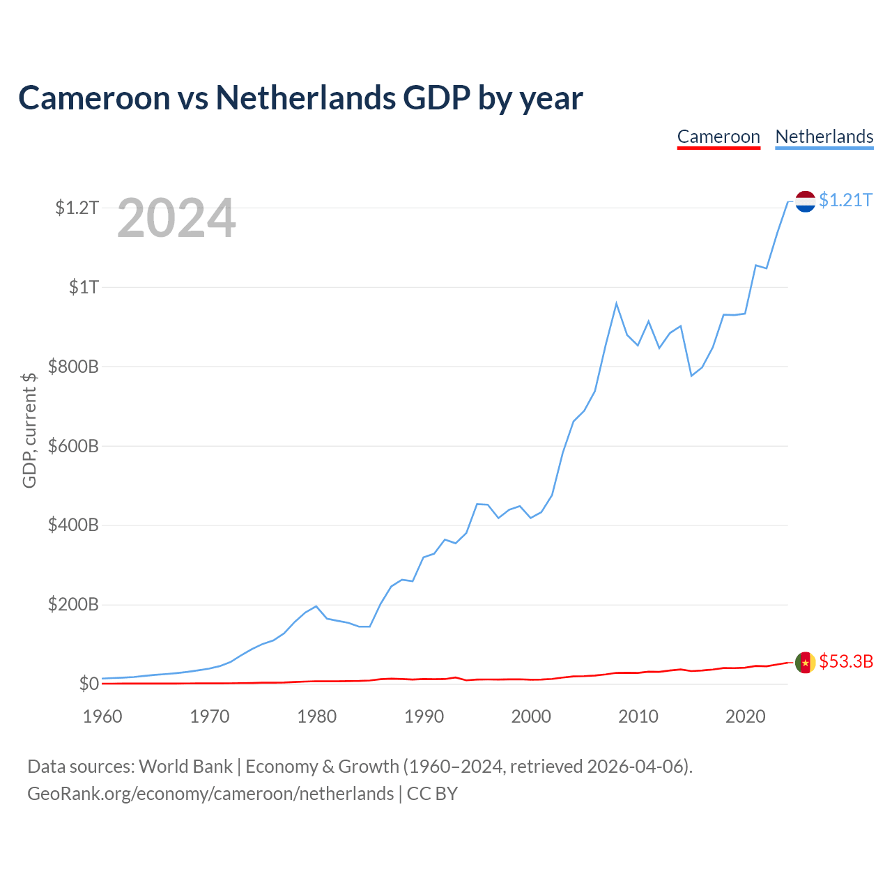 Cameroon has a GDP of $53.3B compared to $1.21T for the Netherlands, ranking 91/197 and 19/197 by economy size, respectively.