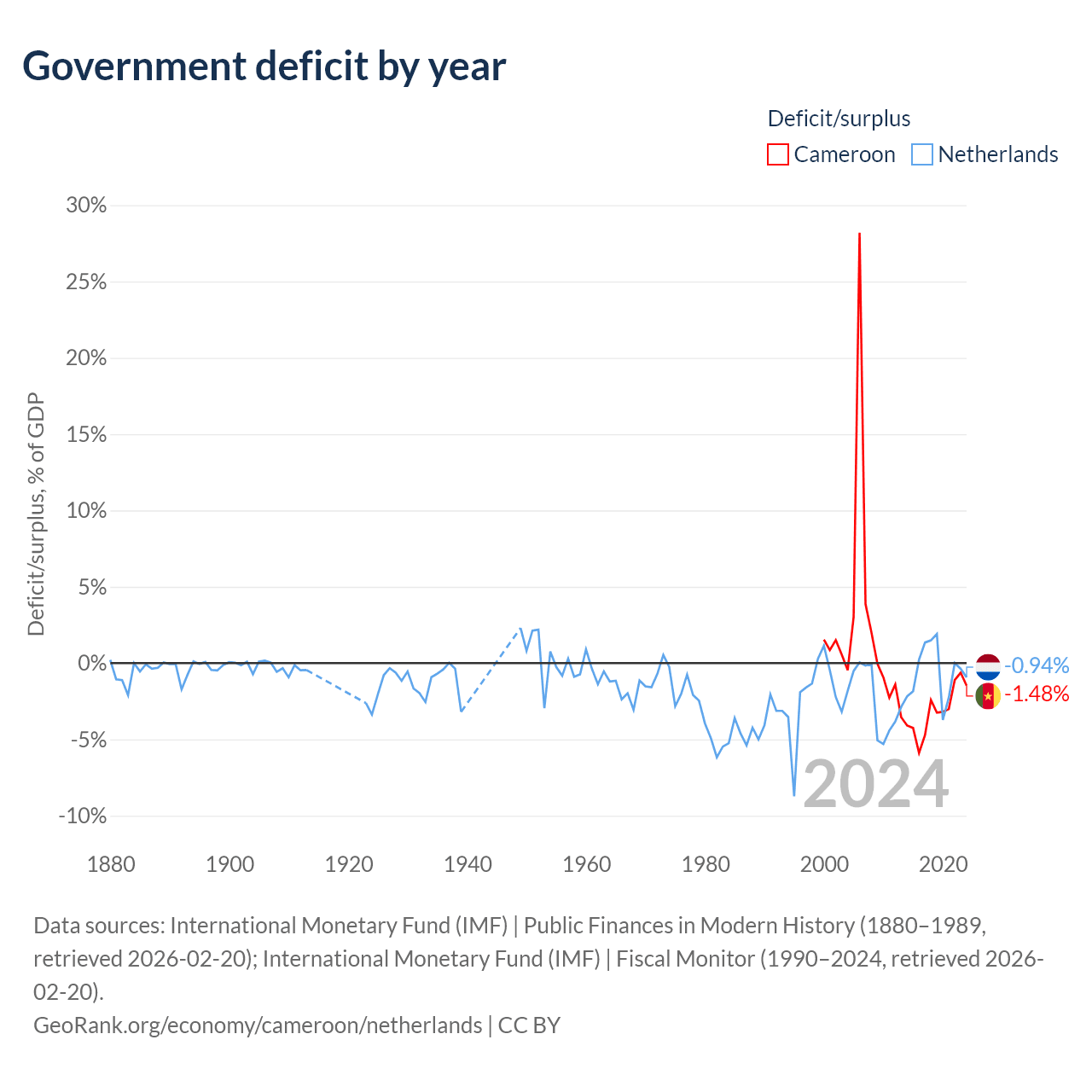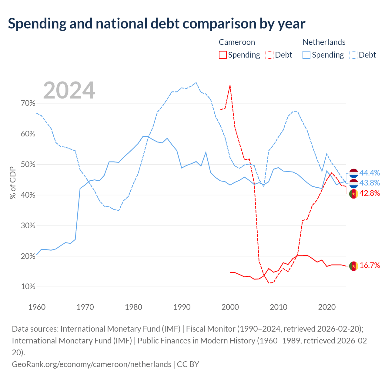 Cameroon has $22.8B in government debt (42.8% of GDP), compared to $532B (43.8% of GDP) in the Netherlands.