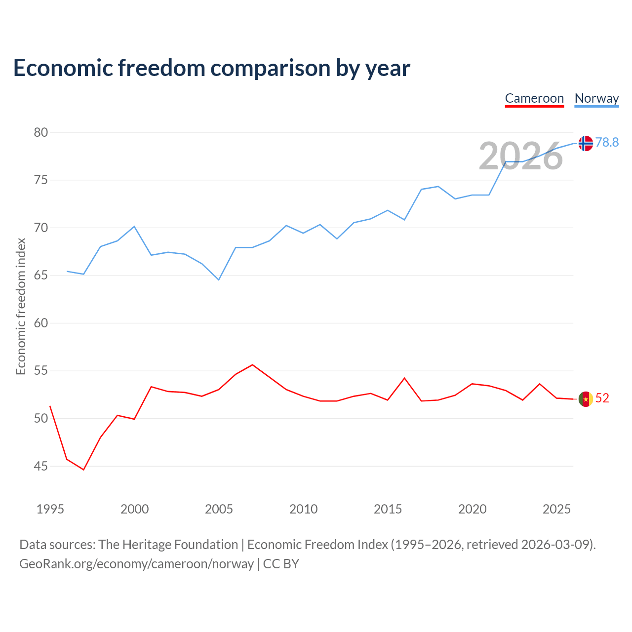 The Economic Freedom Index for Cameroon is 52, ranking 151/197, compared to 78.8 for Norway, ranking 9/197. The chart above displays a comparison of annual changes in economic freedom indexes.