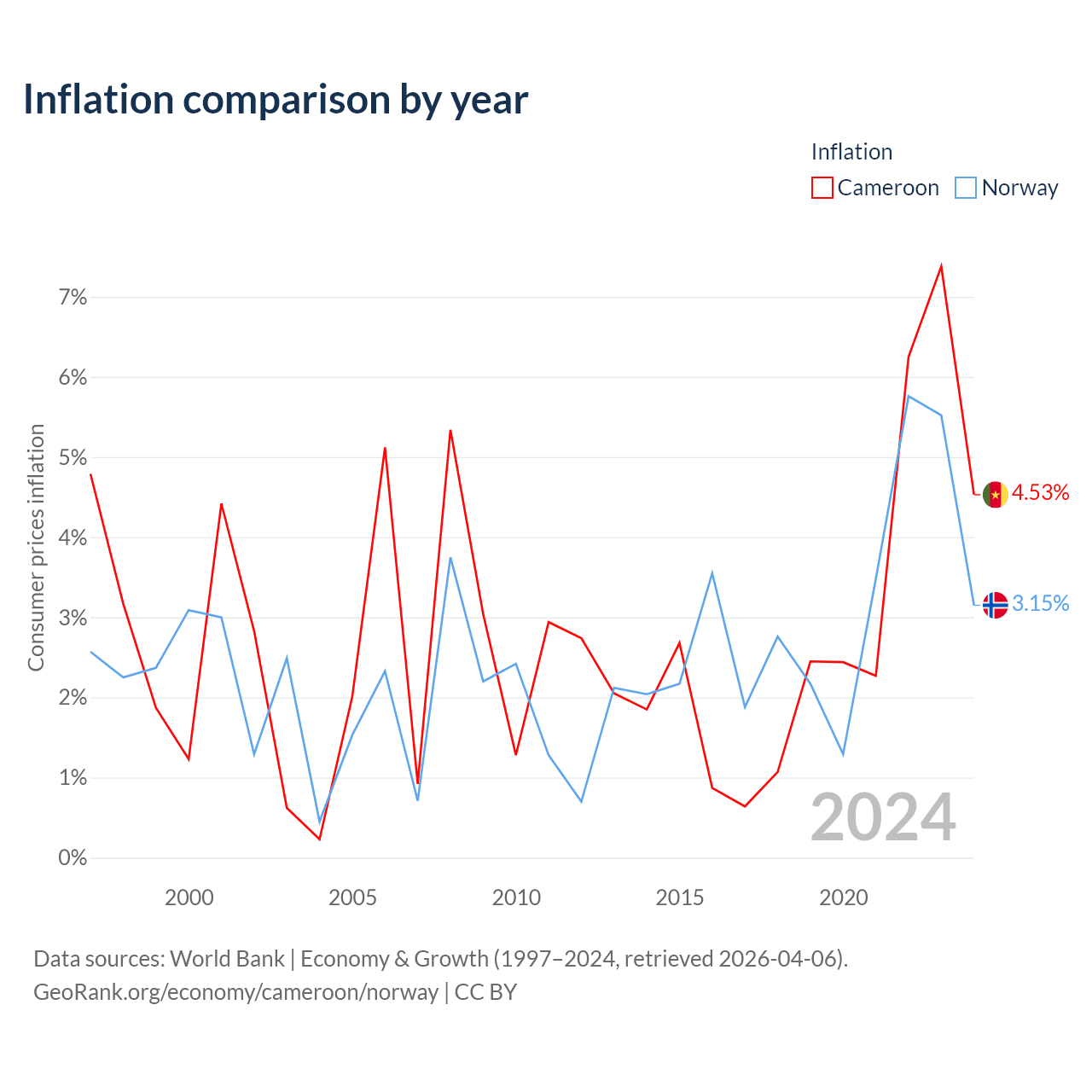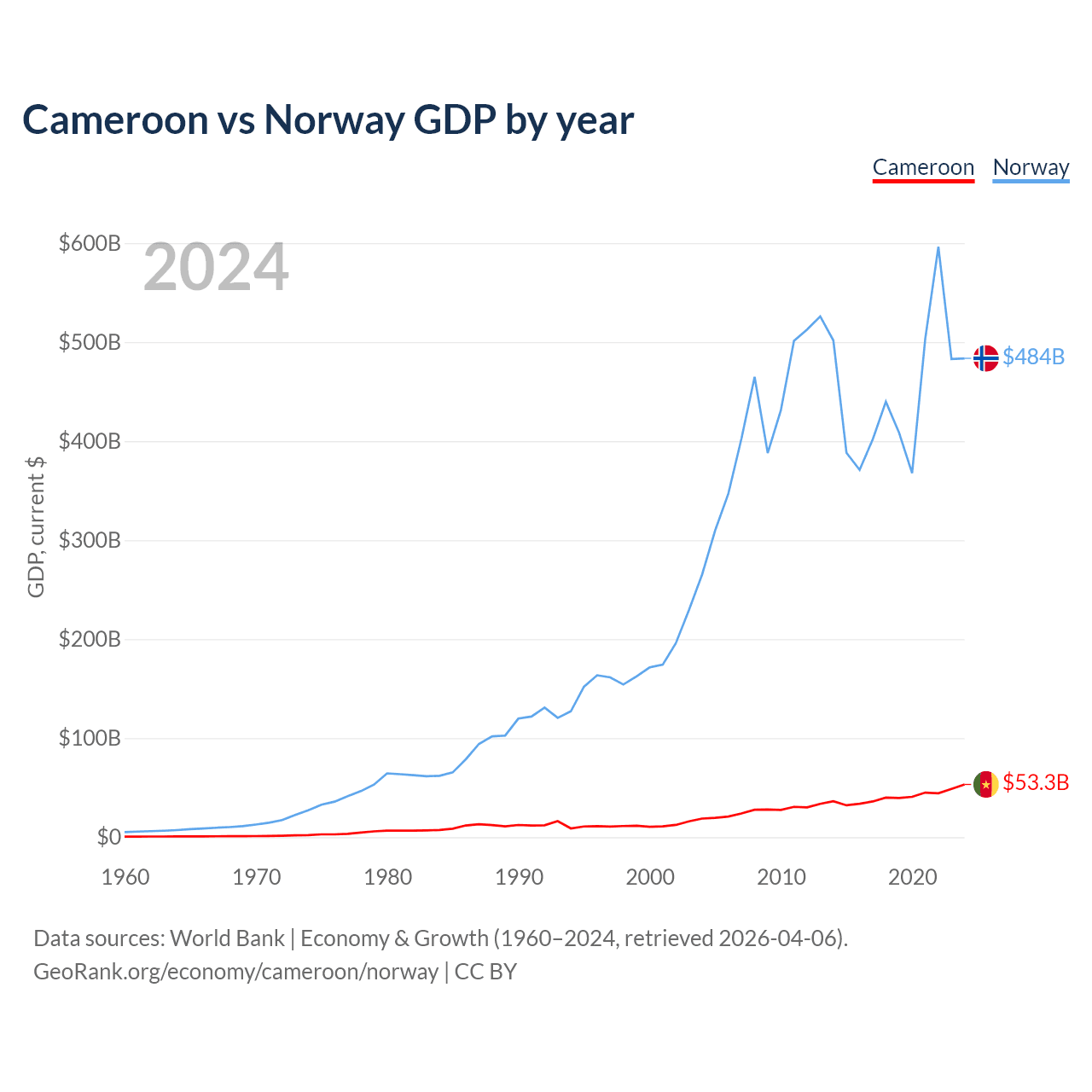 Cameroon has a GDP of $53.3B compared to $484B for Norway, ranking 91/197 and 32/197 by economy size, respectively.