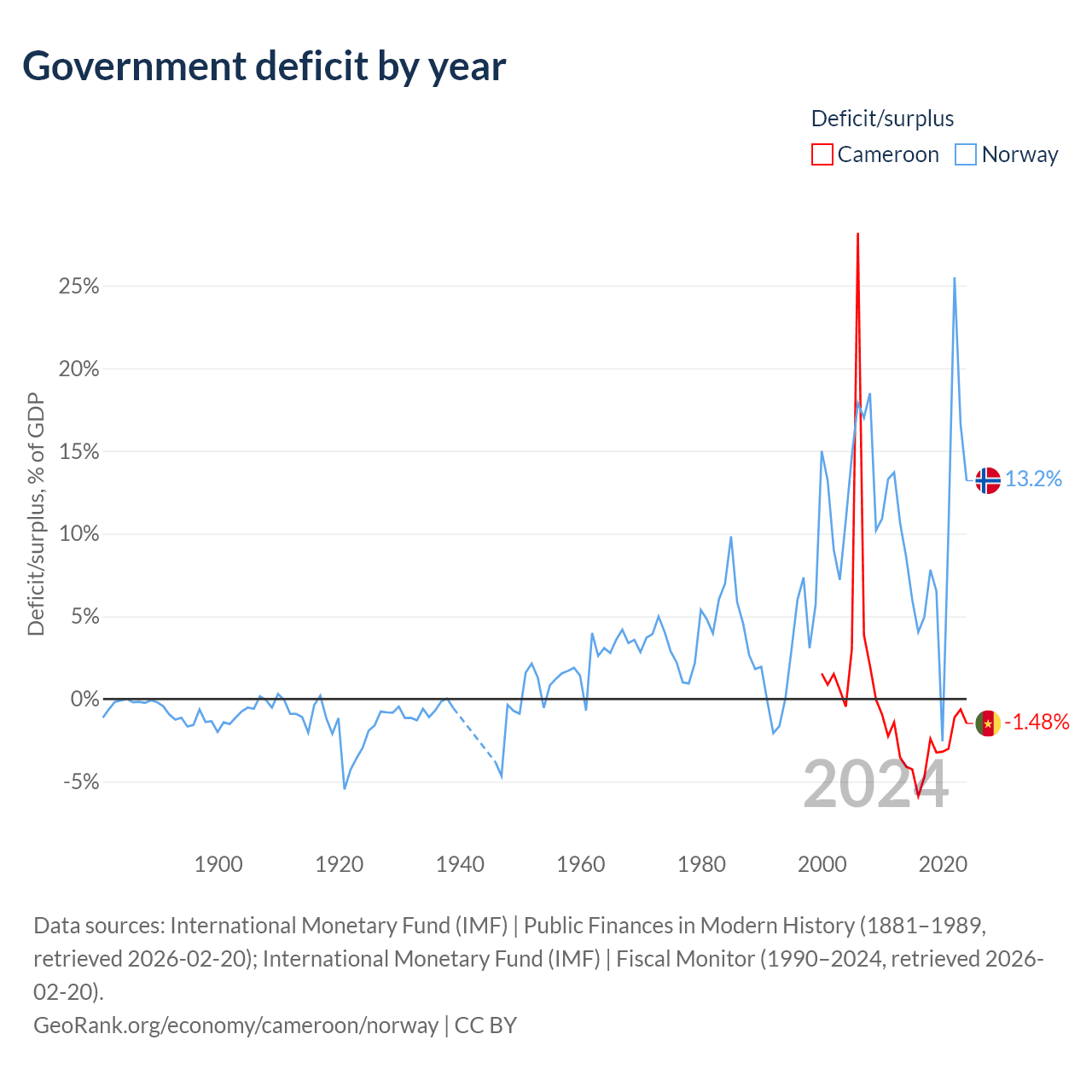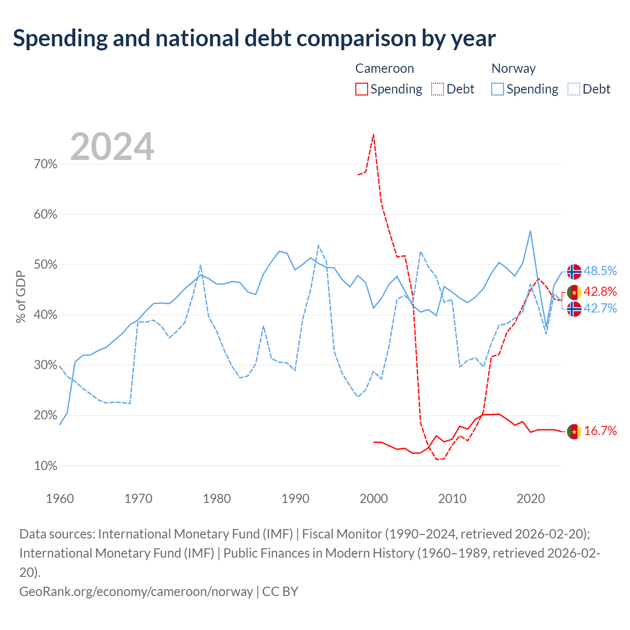 Cameroon has $22.8B in government debt (42.8% of GDP), compared to $207B (42.7% of GDP) in Norway.