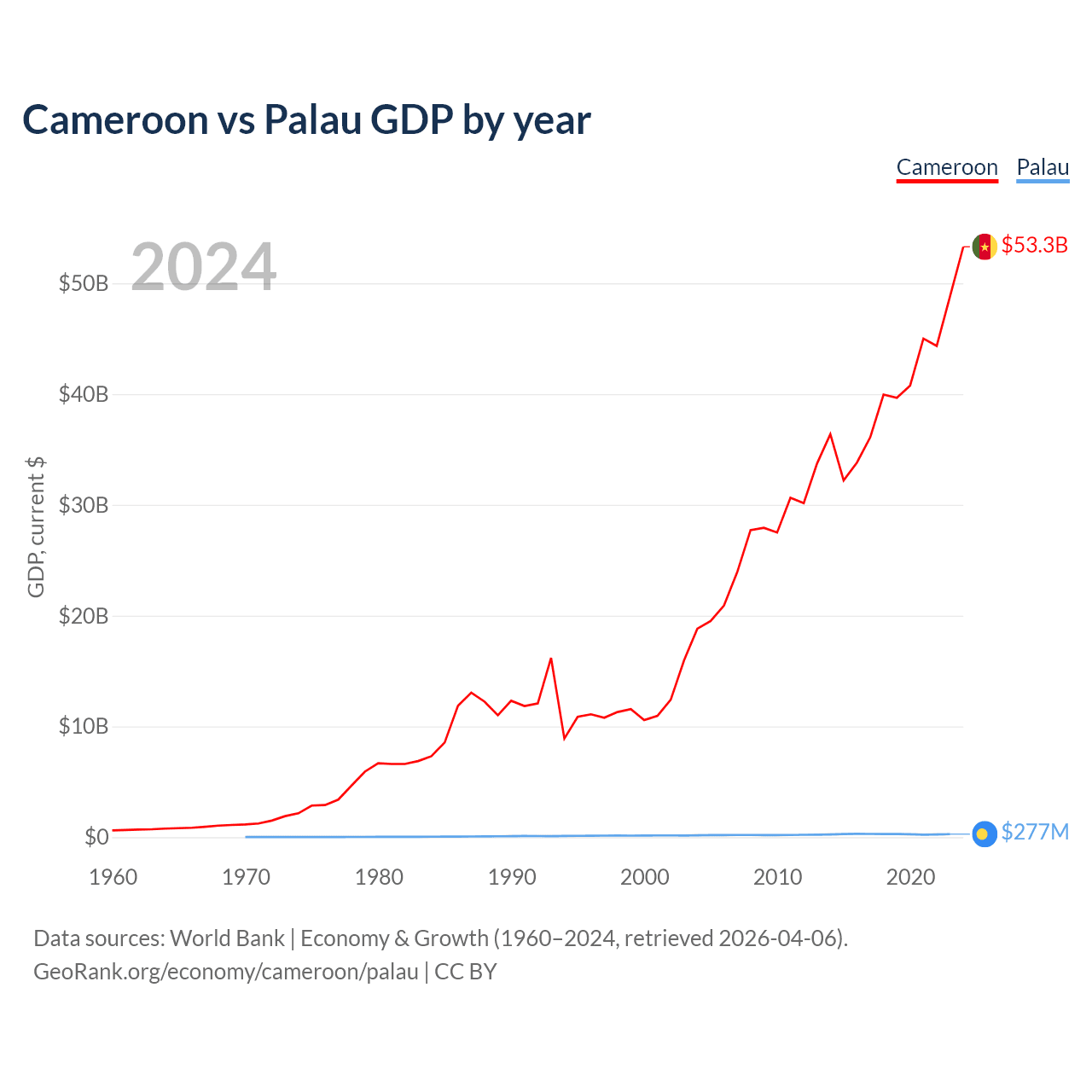 Cameroon has a GDP of $53.3B compared to $277M for Palau, ranking 91/197 and 194/197 by economy size, respectively.