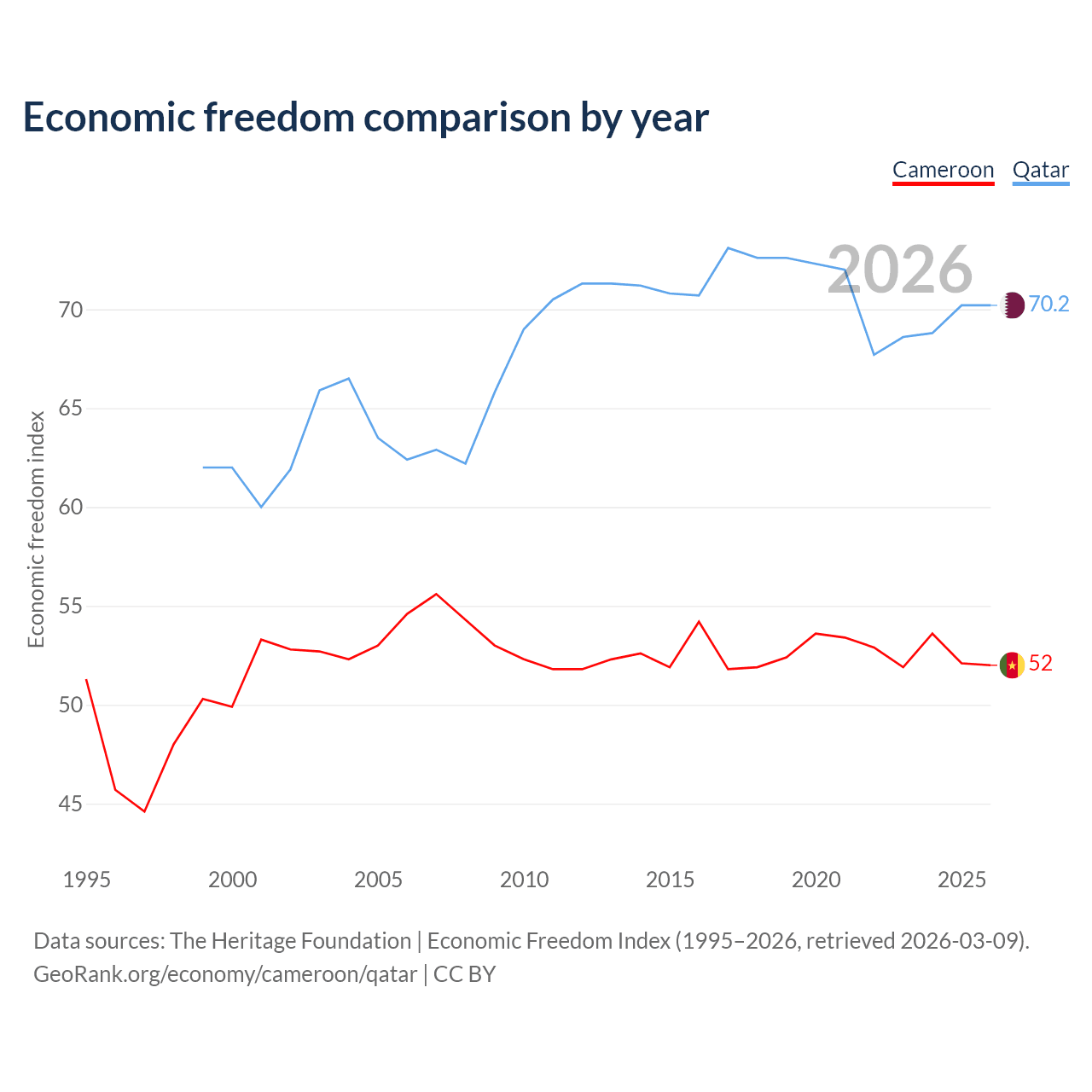 The Economic Freedom Index for Cameroon is 52, ranking 151/197, compared to 70.2 for Qatar, ranking 37/197. The chart above displays a comparison of annual changes in economic freedom indexes.