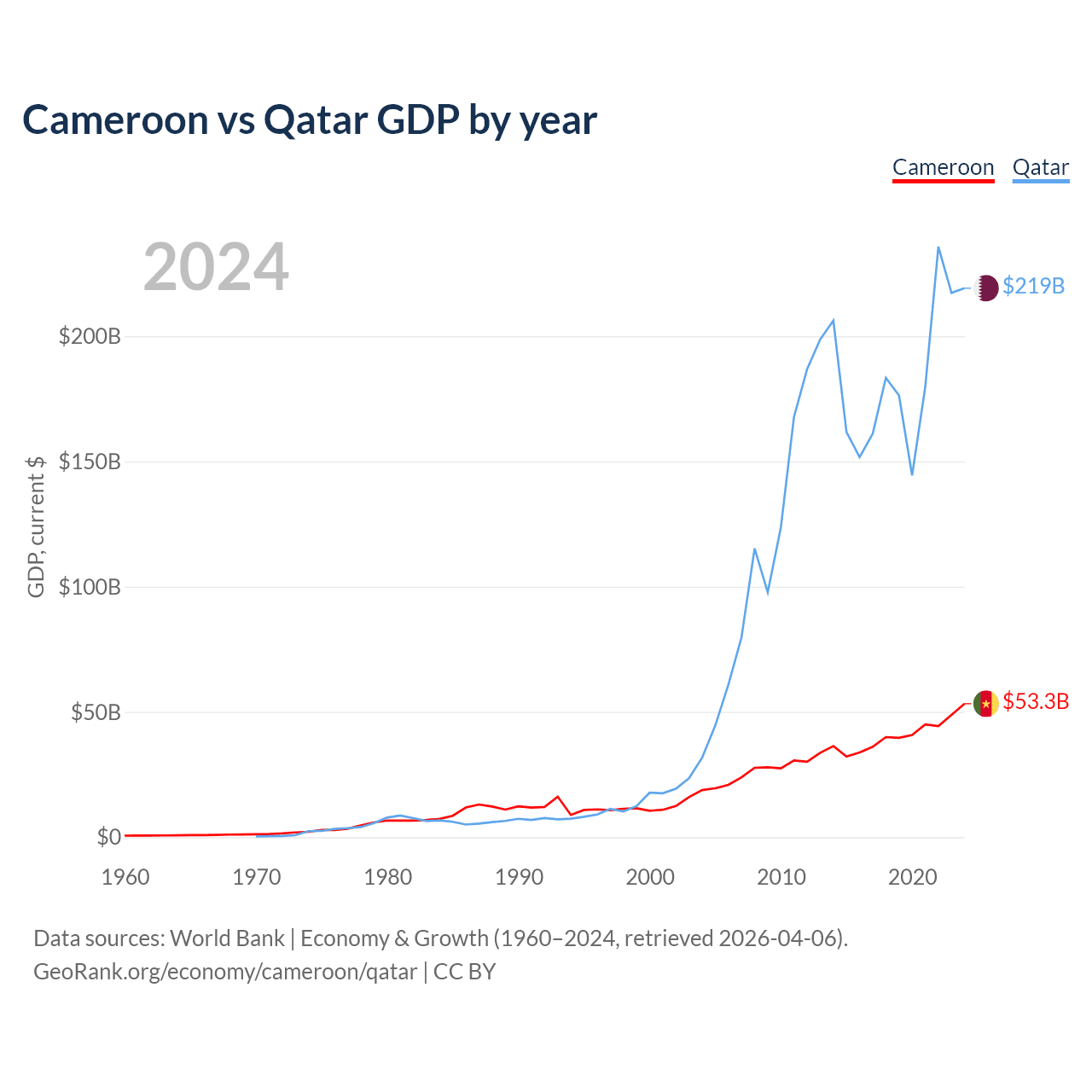 Cameroon has a GDP of $53.3B compared to $219B for Qatar, ranking 91/197 and 56/197 by economy size, respectively.