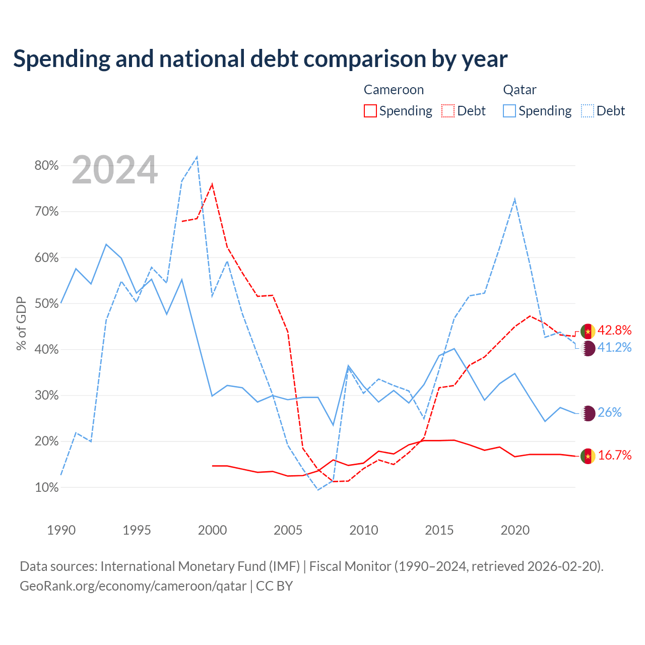 Cameroon has $22.8B in government debt (42.8% of GDP), compared to $90.2B (41.2% of GDP) in Qatar.