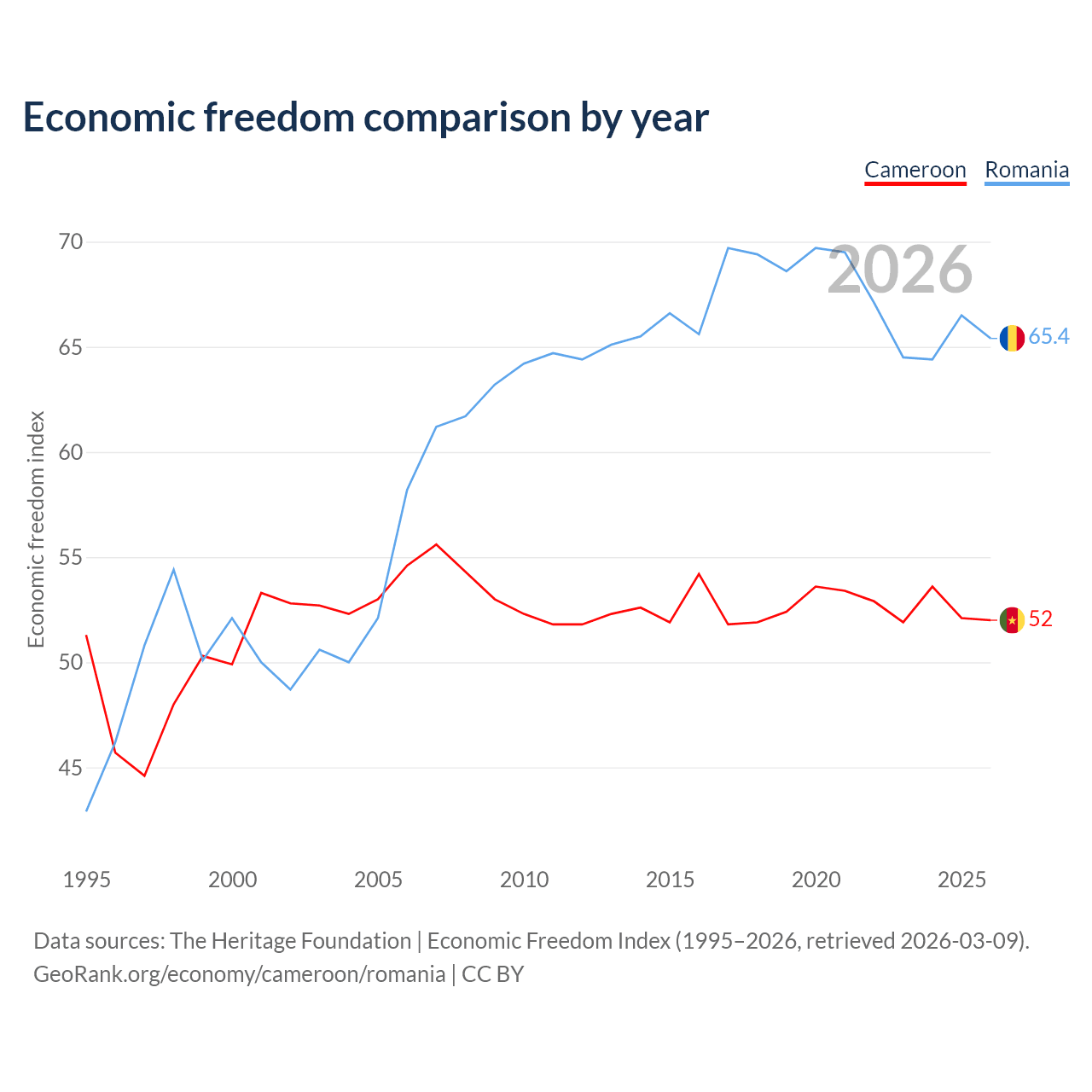 The Economic Freedom Index for Cameroon is 52, ranking 151/197, compared to 65.4 for Romania, ranking 64/197. The chart above displays a comparison of annual changes in economic freedom indexes.