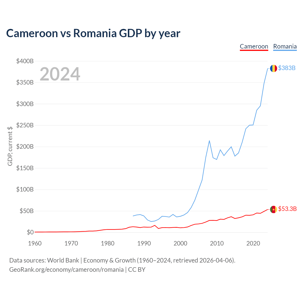 Cameroon vs Romania GDP by year