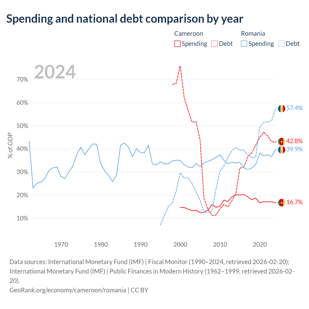 Cameroon has $22.8B in government debt (42.8% of GDP), compared to $220B (57.4% of GDP) in Romania.