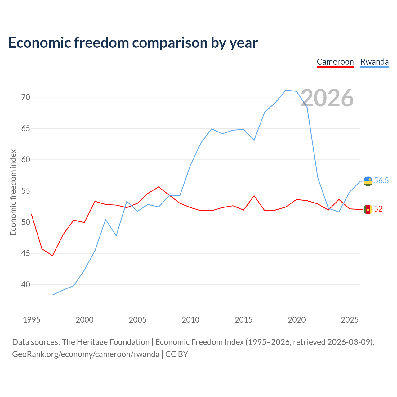 The Economic Freedom Index for Cameroon is 52, ranking 151/197, compared to 56.5 for Rwanda, ranking 121/197. The chart above displays a comparison of annual changes in economic freedom indexes.