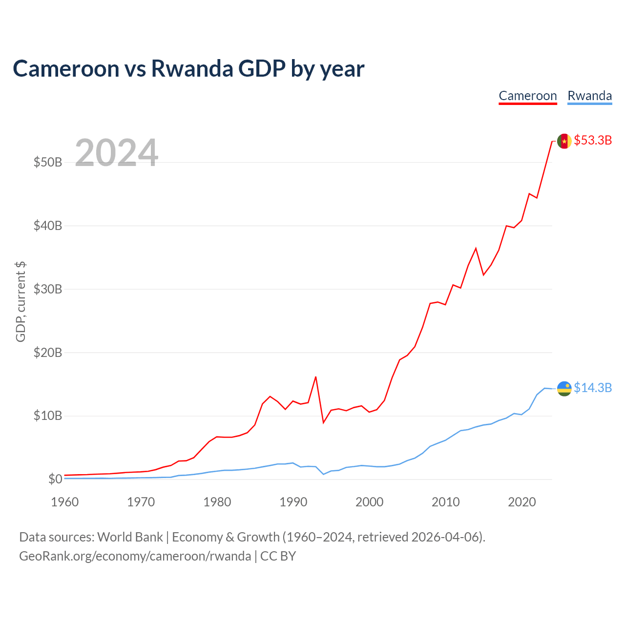 Cameroon has a GDP of $53.3B compared to $14.3B for Rwanda, ranking 91/197 and 144/197 by economy size, respectively.