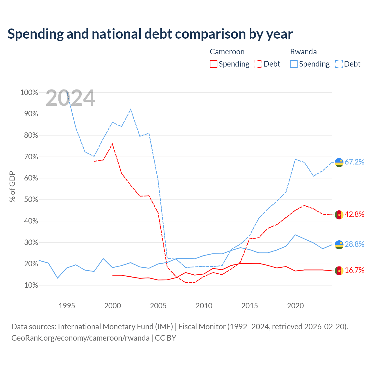 Cameroon has $22.8B in government debt (42.8% of GDP), compared to $9.58B (67.2% of GDP) in Rwanda.