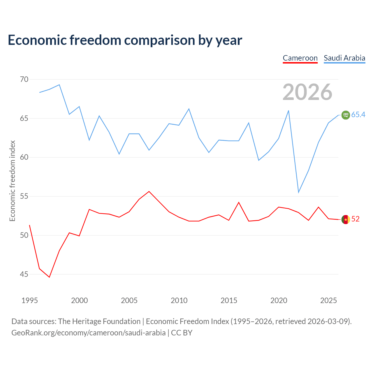 The Economic Freedom Index for Cameroon is 52, ranking 151/197, compared to 65.4 for Saudi Arabia, ranking 65/197. The chart above displays a comparison of annual changes in economic freedom indexes.