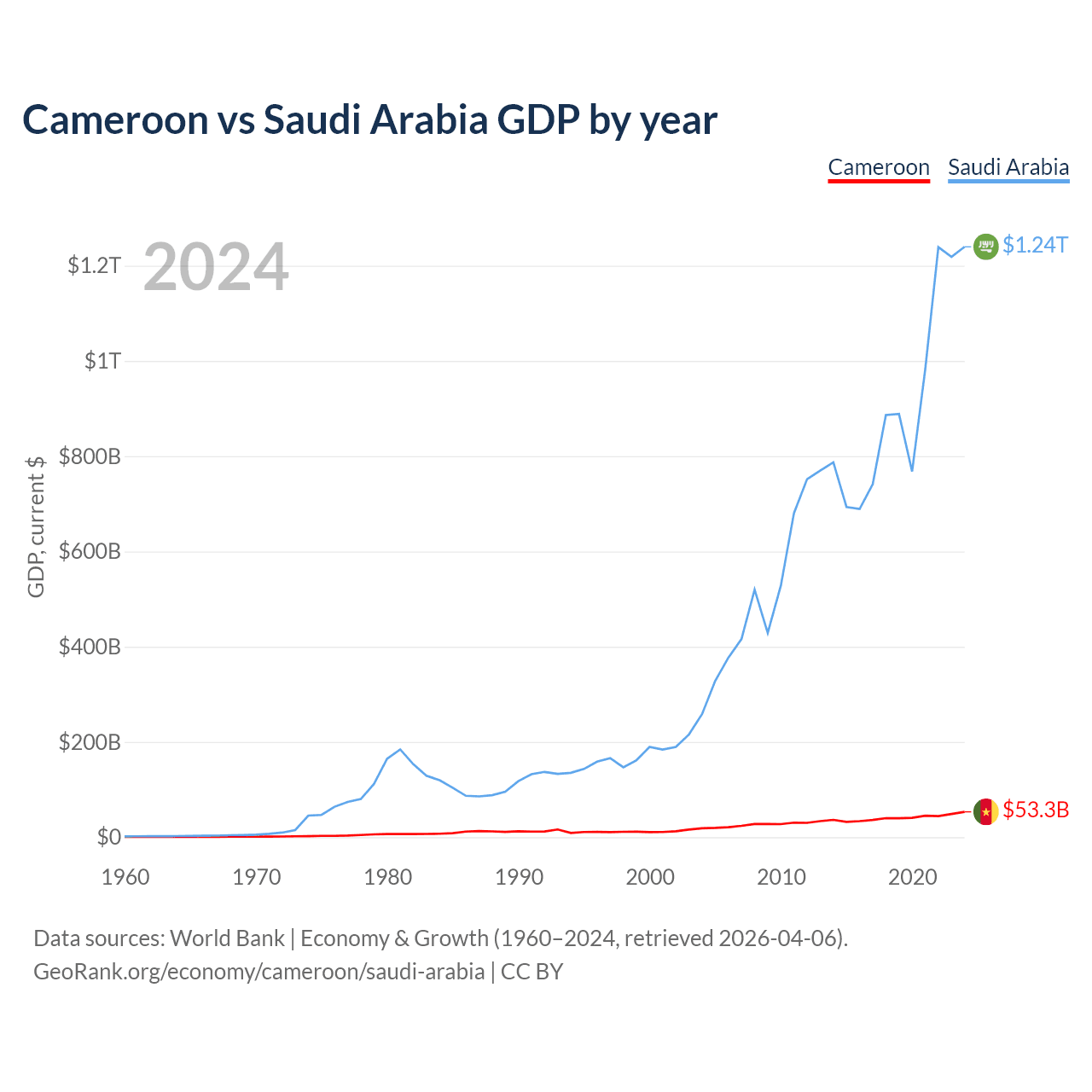 Cameroon has a GDP of $53.3B compared to $1.24T for Saudi Arabia, ranking 91/197 and 18/197 by economy size, respectively.