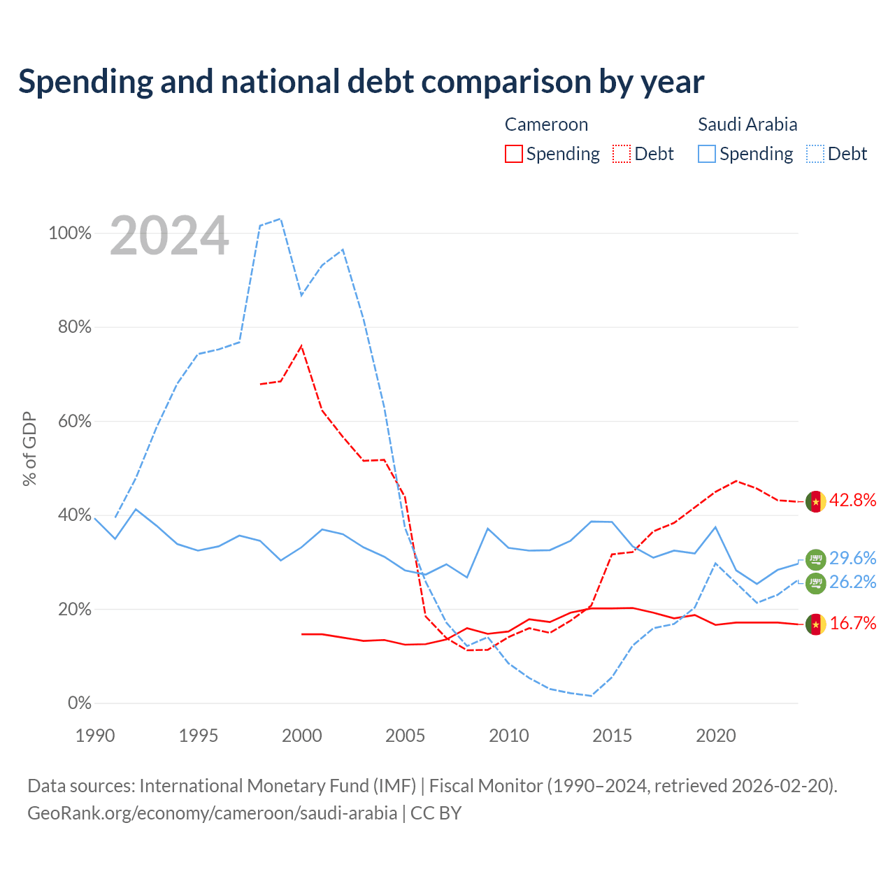 Cameroon has $22.8B in government debt (42.8% of GDP), compared to $324B (26.2% of GDP) in Saudi Arabia.