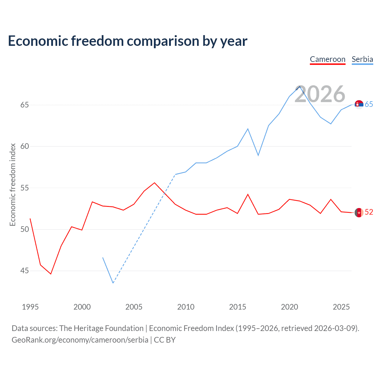 The Economic Freedom Index for Cameroon is 52, ranking 151/197, compared to 65 for Serbia, ranking 68/197. The chart above displays a comparison of annual changes in economic freedom indexes.