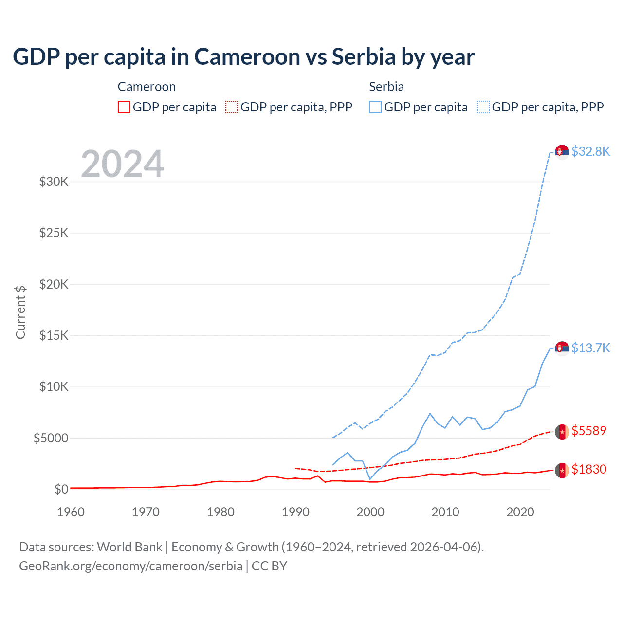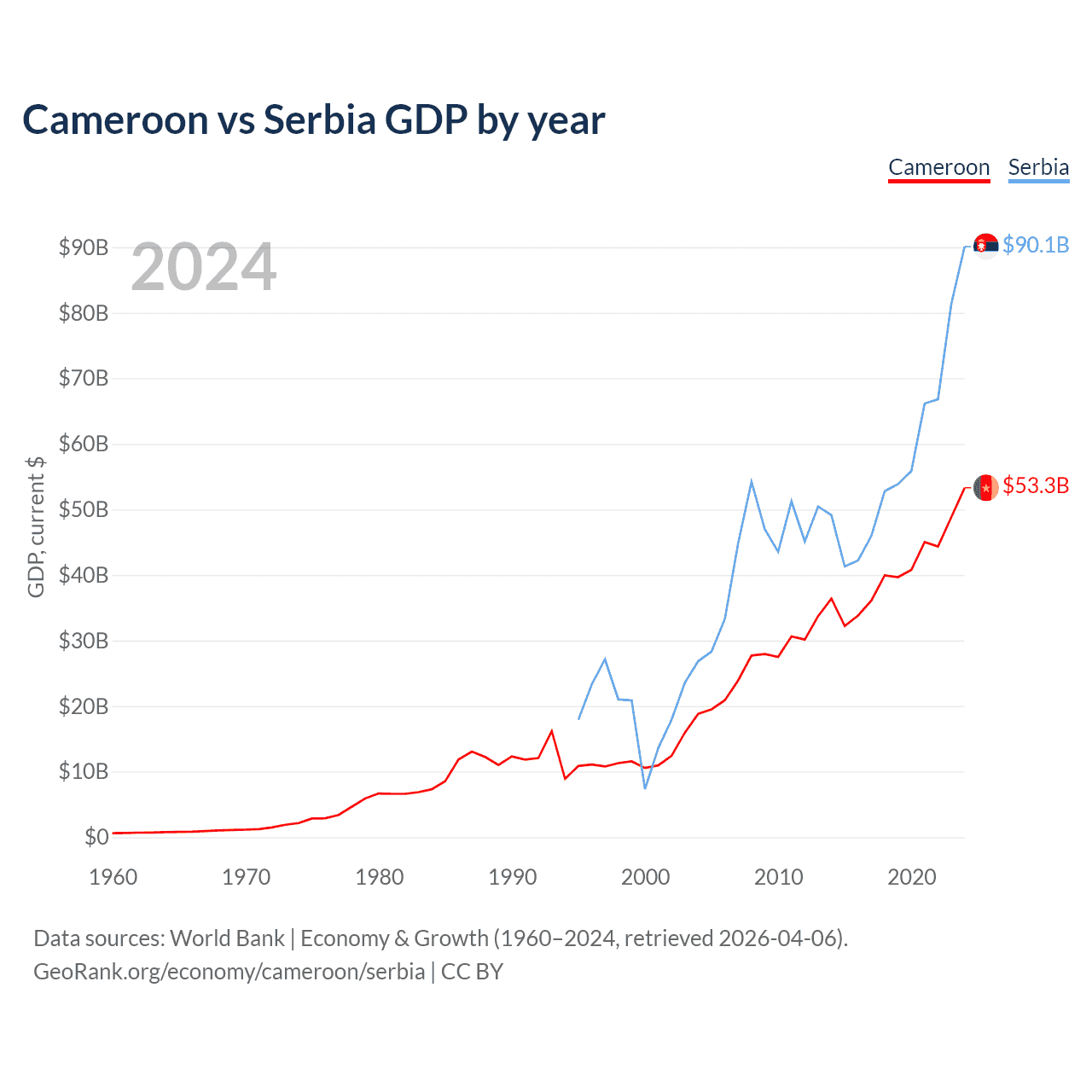 Cameroon has a GDP of $53.3B compared to $90.1B for Serbia, ranking 91/197 and 76/197 by economy size, respectively.
