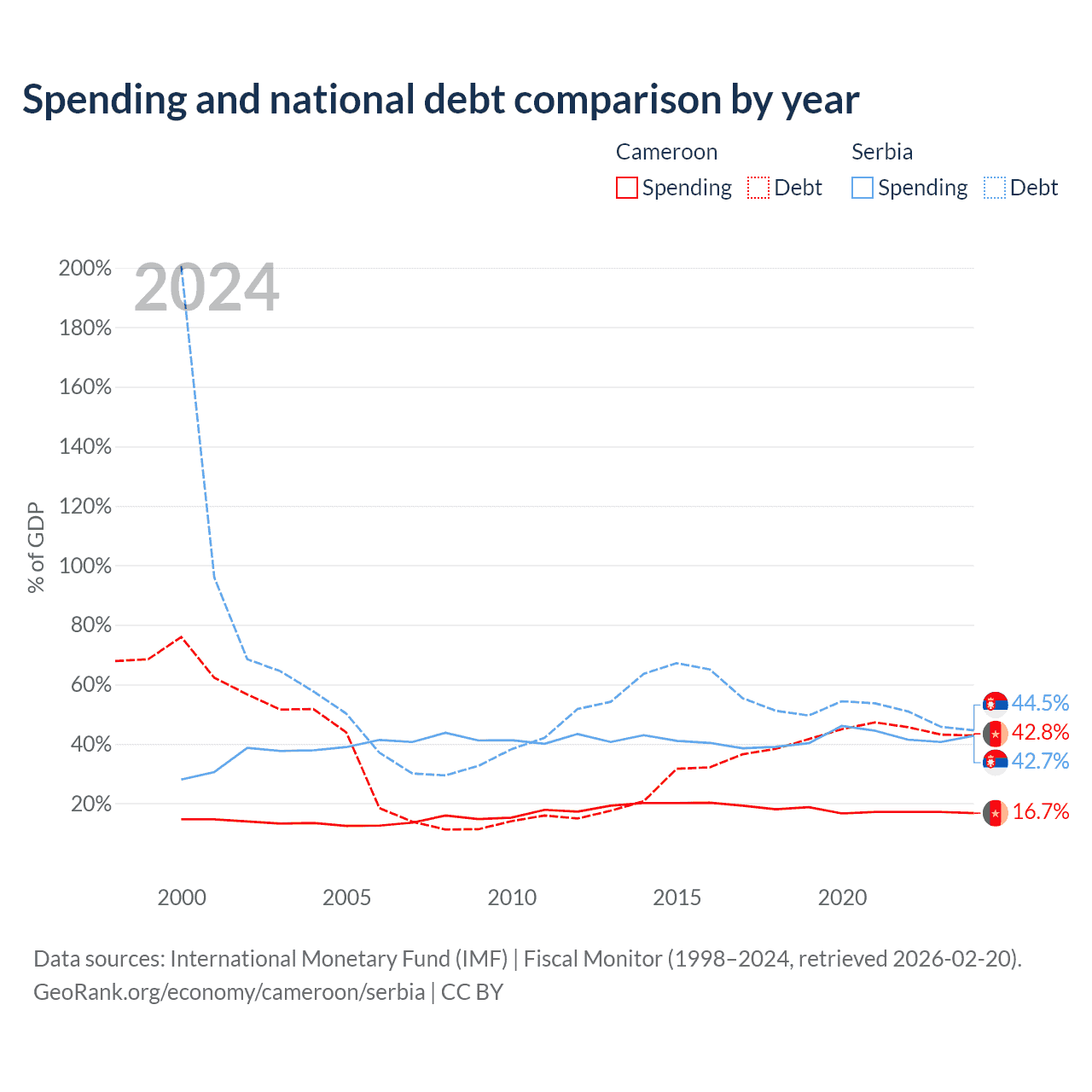 Cameroon has $22.8B in government debt (42.8% of GDP), compared to $40.1B (44.5% of GDP) in Serbia.