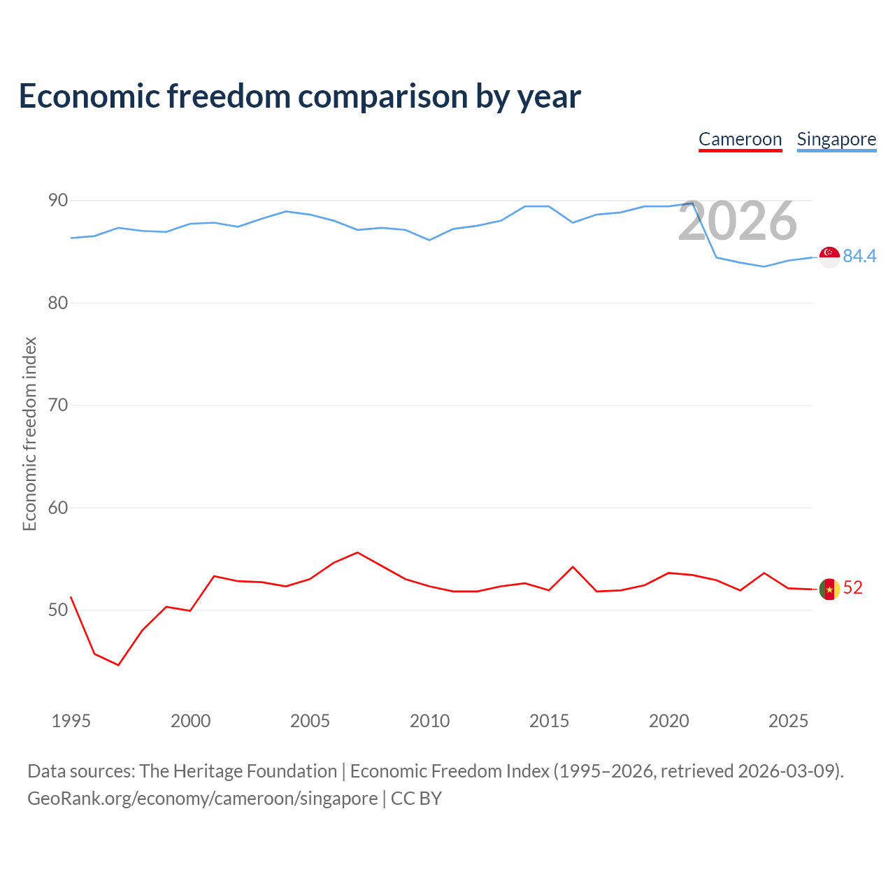 The Economic Freedom Index for Cameroon is 52, ranking 151/197, compared to 84.4 for Singapore, ranking 1/197. The chart above displays a comparison of annual changes in economic freedom indexes.