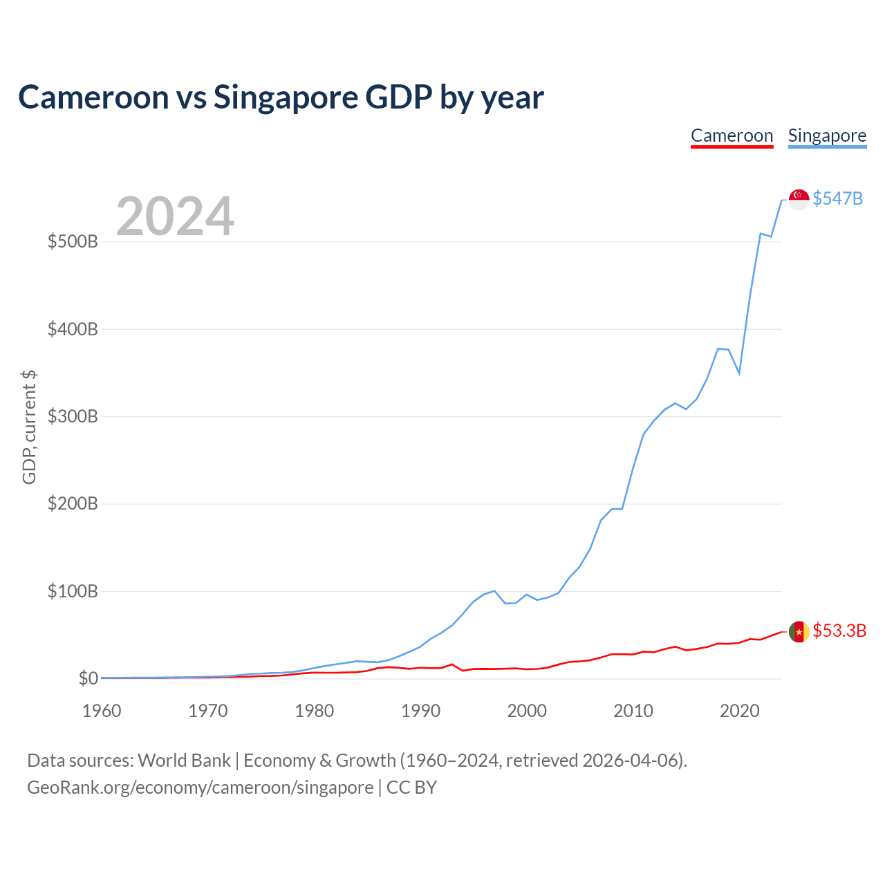 Cameroon has a GDP of $53.3B compared to $547B for Singapore, ranking 91/197 and 28/197 by economy size, respectively.