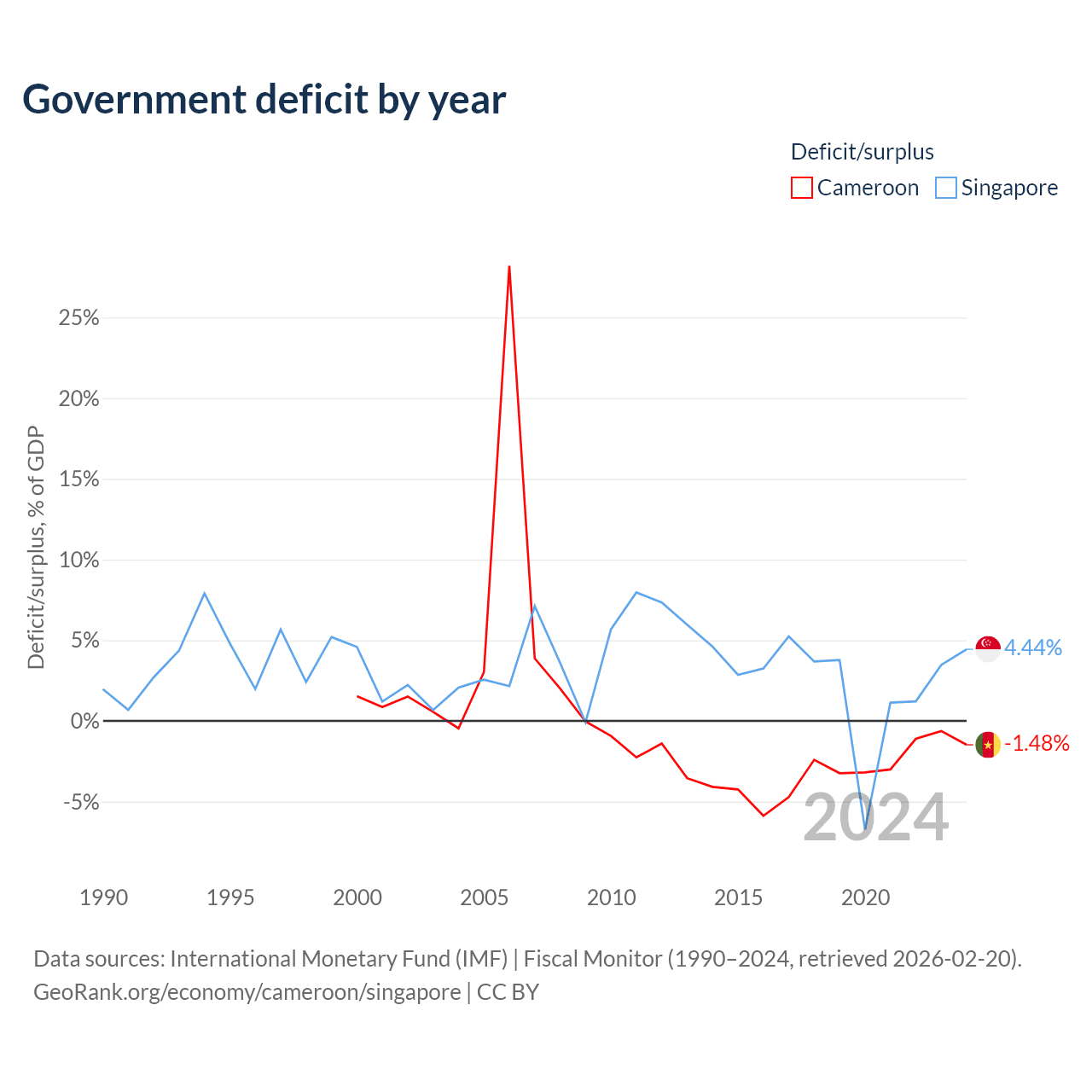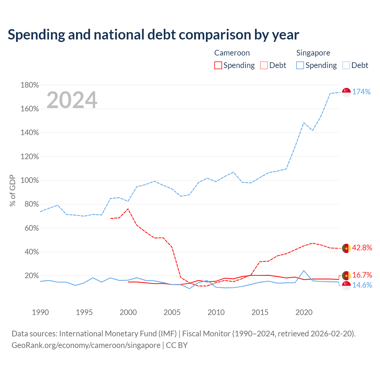 Cameroon has $22.8B in government debt (42.8% of GDP), compared to $950B (173.5% of GDP) in Singapore.
