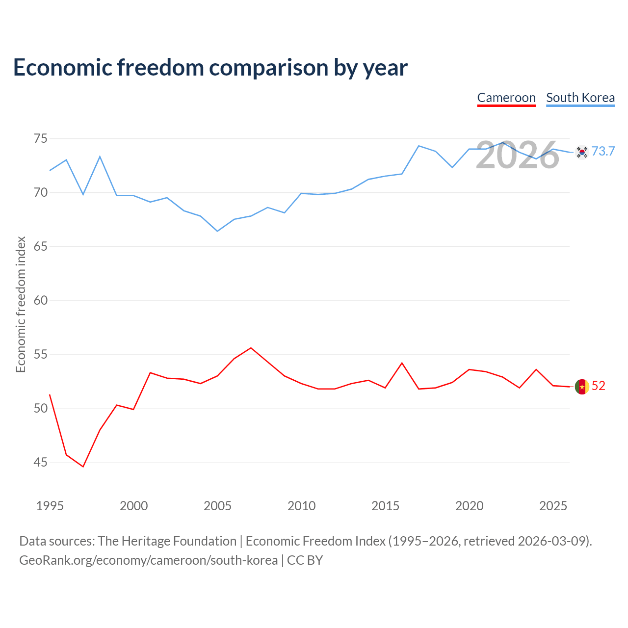 The Economic Freedom Index for Cameroon is 52, ranking 151/197, compared to 73.7 for South Korea, ranking 24/197. The chart above displays a comparison of annual changes in economic freedom indexes.