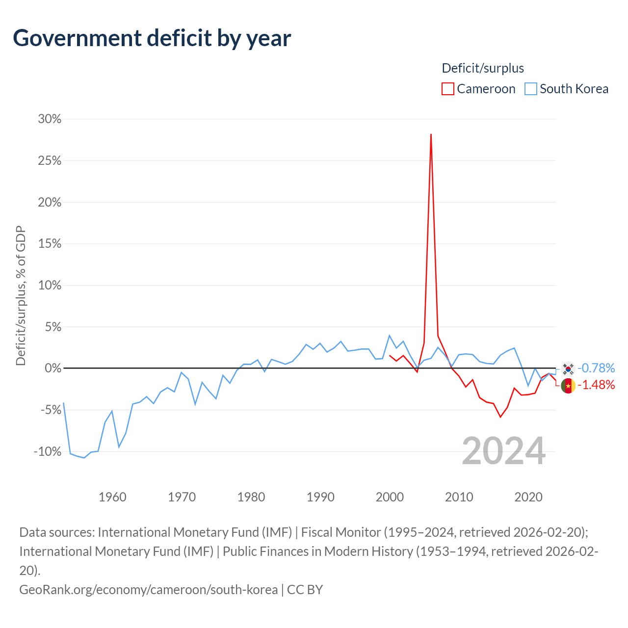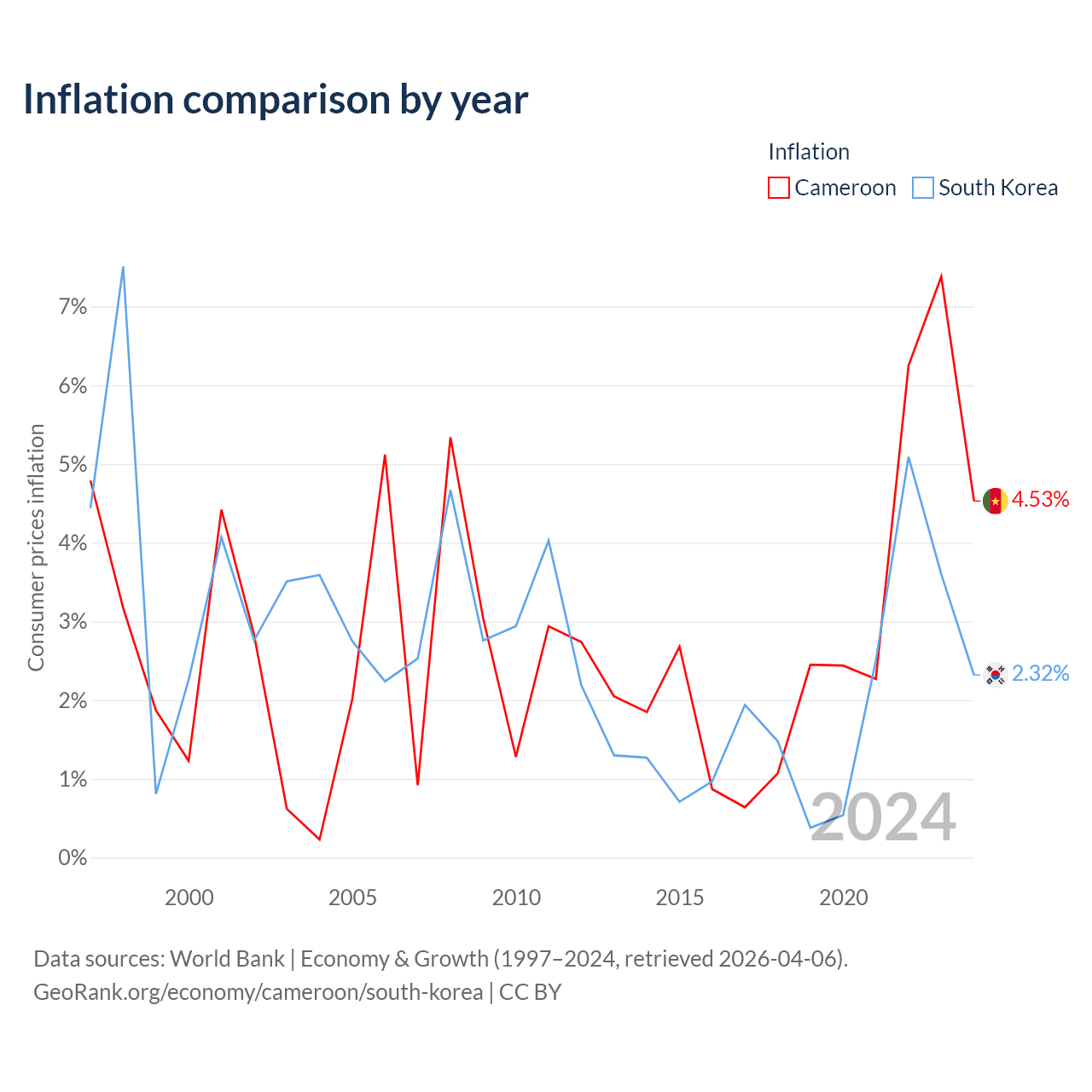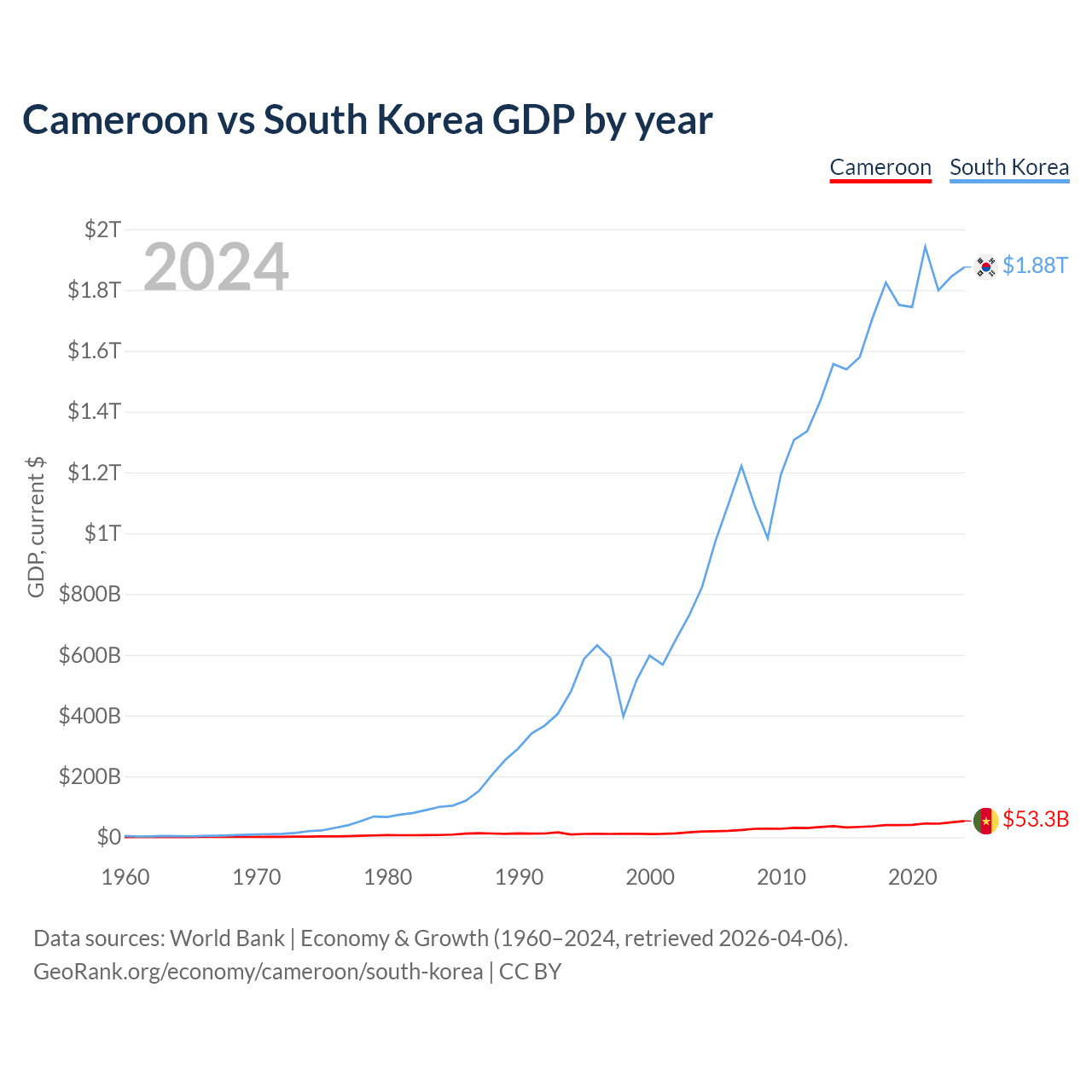 Cameroon has a GDP of $53.3B compared to $1.88T for South Korea, ranking 91/197 and 12/197 by economy size, respectively.