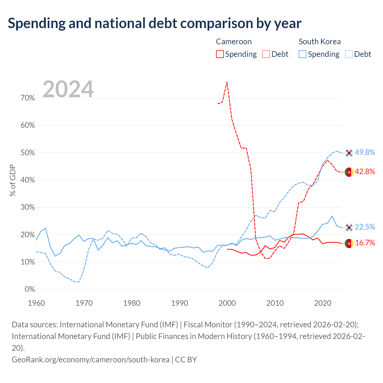 Cameroon has $22.8B in government debt (42.8% of GDP), compared to $934B (49.8% of GDP) in South Korea.