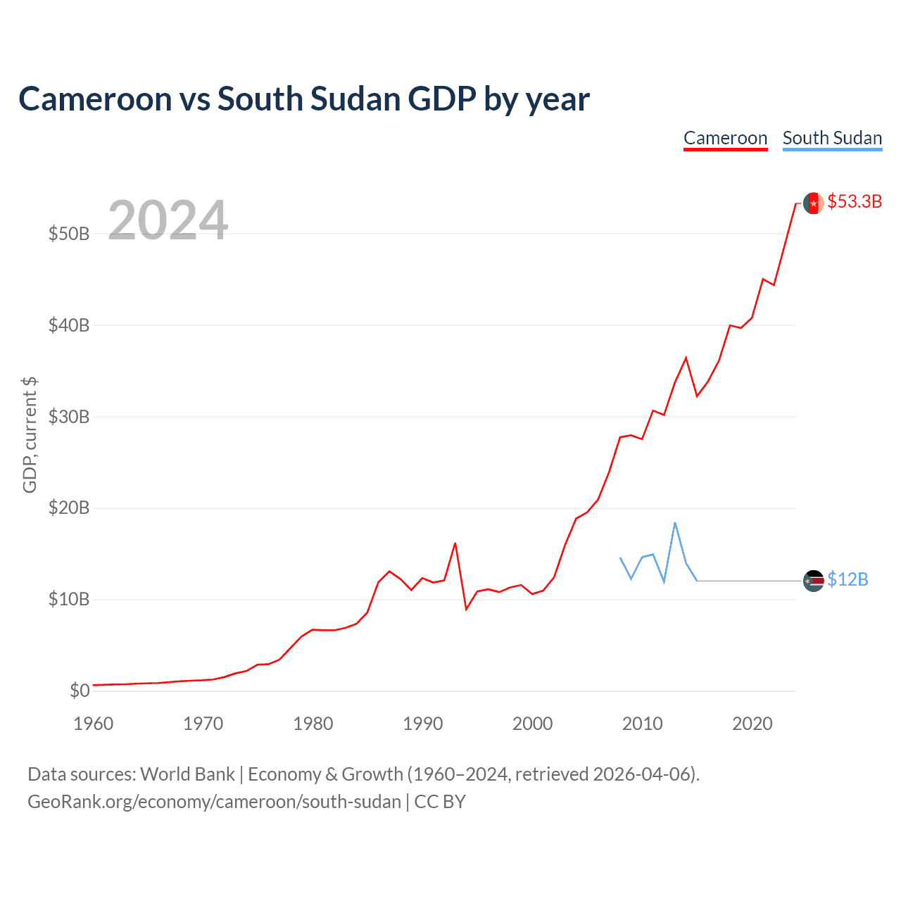 Cameroon has a GDP of $53.3B compared to $12B for South Sudan, ranking 91/197 and 149/197 by economy size, respectively.