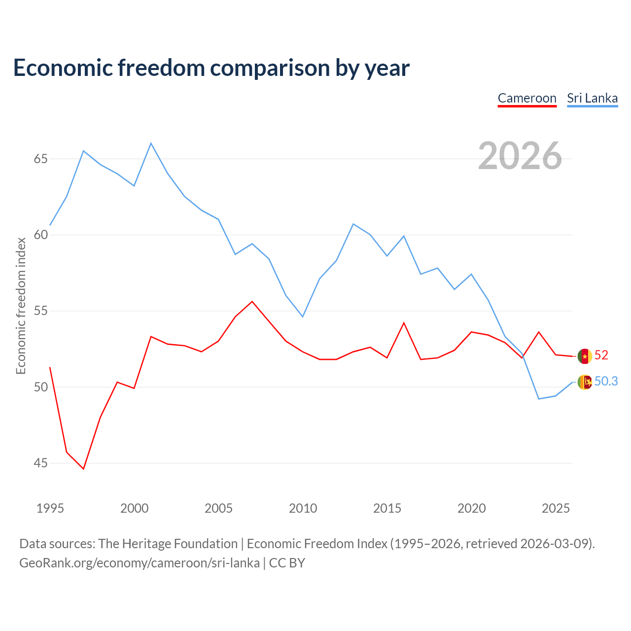 The Economic Freedom Index for Cameroon is 52, ranking 151/197, compared to 50.3 for Sri Lanka, ranking 162/197. The chart above displays a comparison of annual changes in economic freedom indexes.