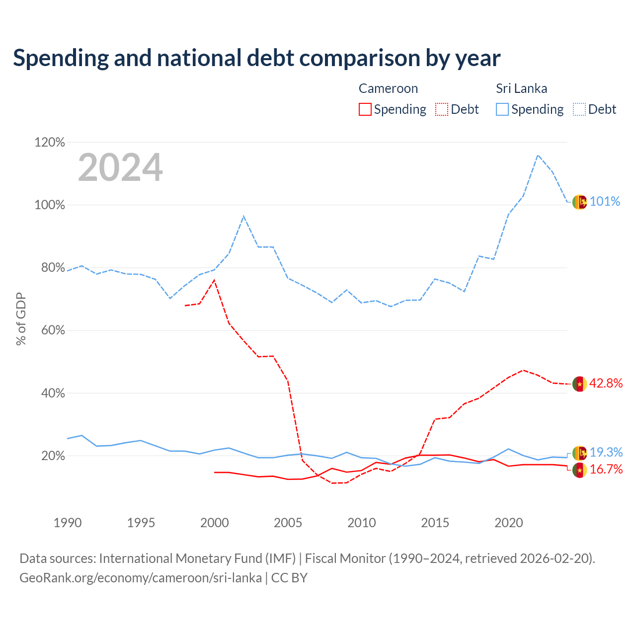 Cameroon has $22.8B in government debt (42.8% of GDP), compared to $99.8B (100.8% of GDP) in Sri Lanka.