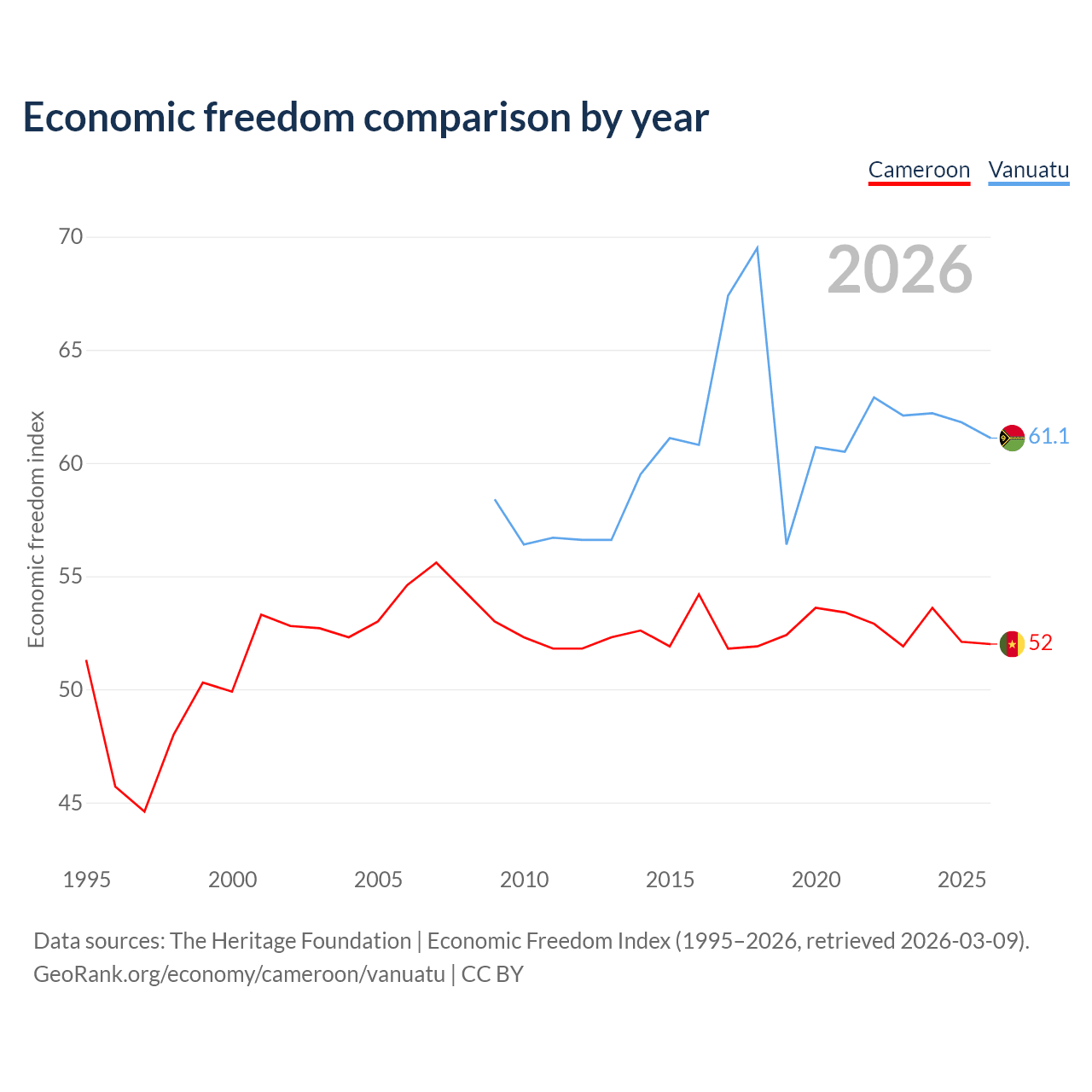 The Economic Freedom Index for Cameroon is 52, ranking 151/197, compared to 61.1 for Vanuatu, ranking 92/197. The chart above displays a comparison of annual changes in economic freedom indexes.