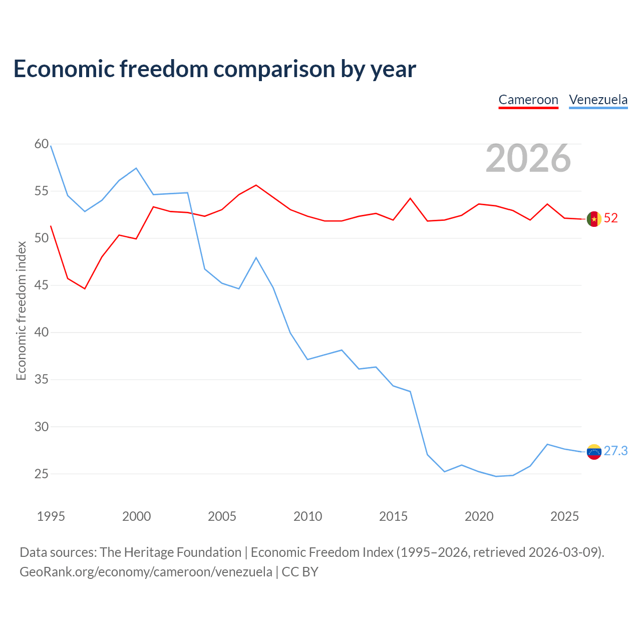 The Economic Freedom Index for Cameroon is 52, ranking 151/197, compared to 27.3 for Venezuela, ranking 194/197. The chart above displays a comparison of annual changes in economic freedom indexes.