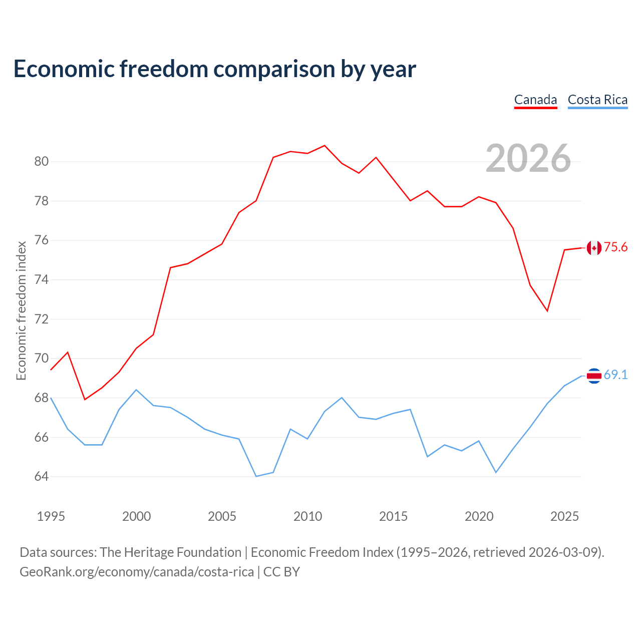 The Economic Freedom Index for Canada is 75.6, ranking 17/197, compared to 69.1 for Costa Rica, ranking 43/197. The chart above displays a comparison of annual changes in economic freedom indexes.
