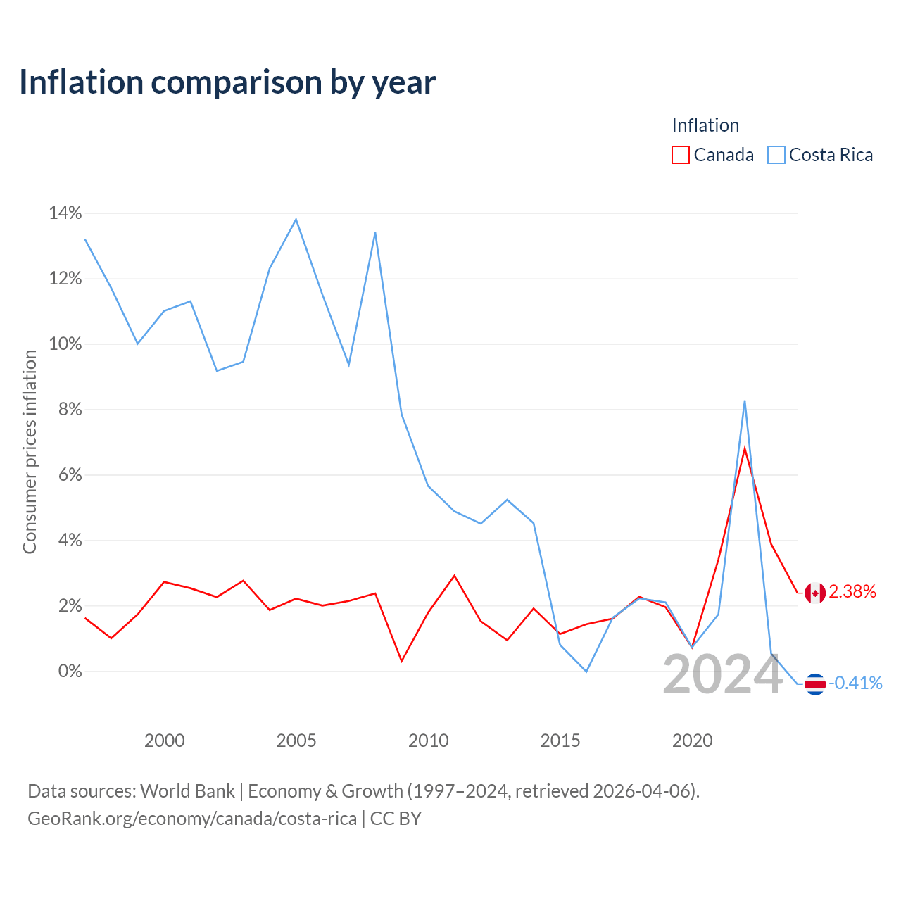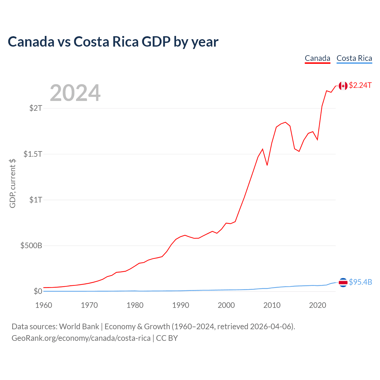 Canada has a GDP of $2.24T compared to $95.4B for Costa Rica, ranking 9/197 and 73/197 by economy size, respectively.