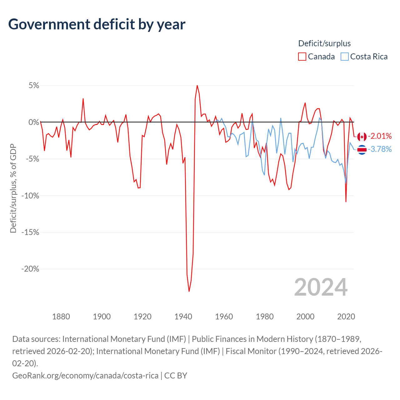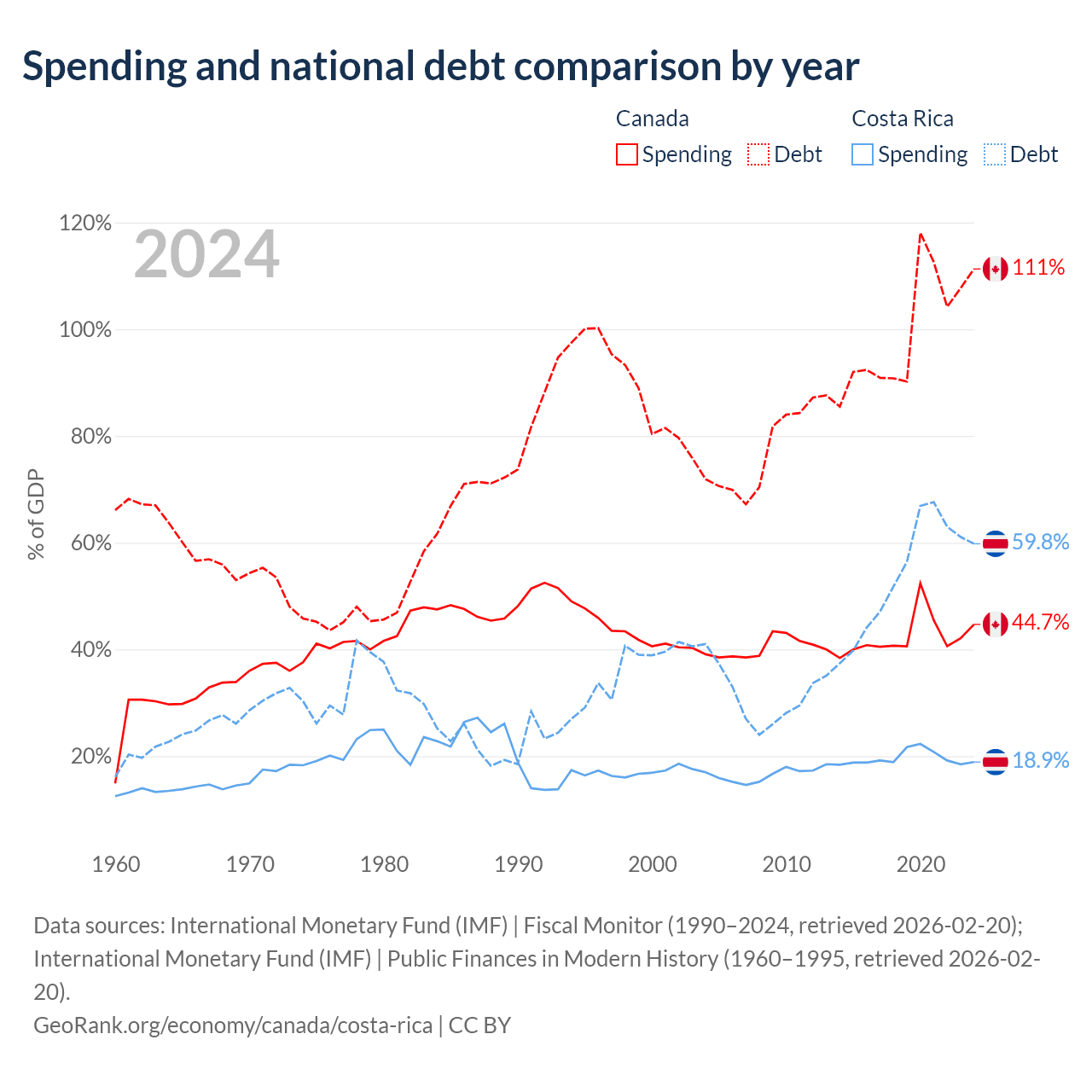 Canada has $2.5T in government debt (111.3% of GDP), compared to $57B (59.8% of GDP) in Costa Rica.