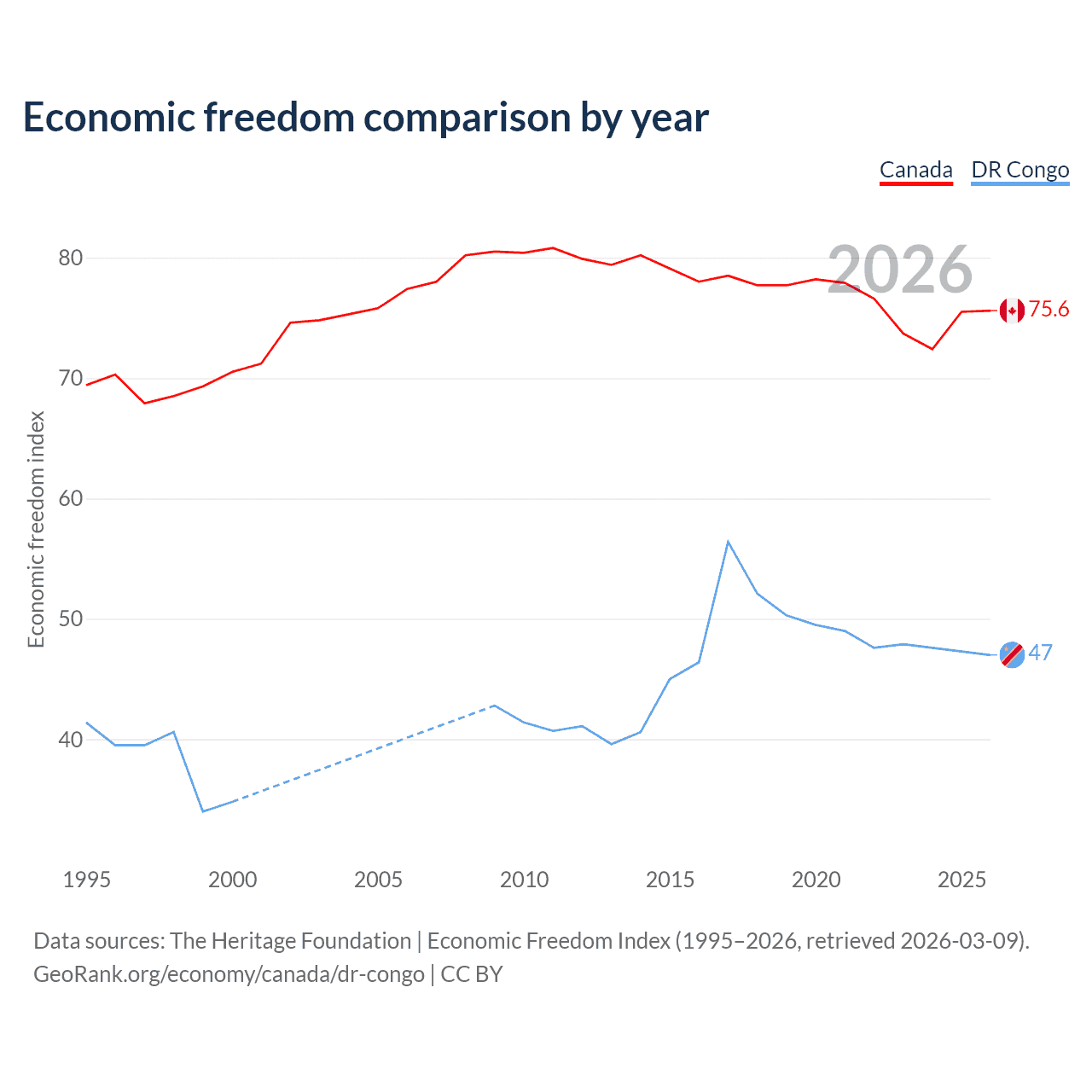 The Economic Freedom Index for Canada is 75.6, ranking 17/197, compared to 47 for the DR Congo, ranking 176/197. The chart above displays a comparison of annual changes in economic freedom indexes.