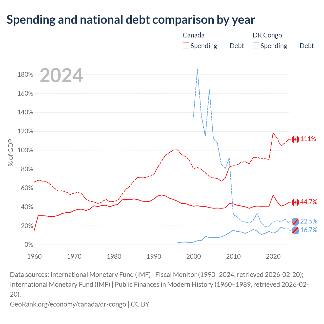 Canada has $2.5T in government debt (111.3% of GDP), compared to $16B (22.5% of GDP) in the DR Congo.