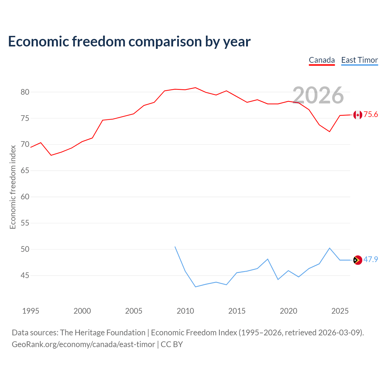 The Economic Freedom Index for Canada is 75.6, ranking 17/197, compared to 47.9 for East Timor, ranking 173/197. The chart above displays a comparison of annual changes in economic freedom indexes.
