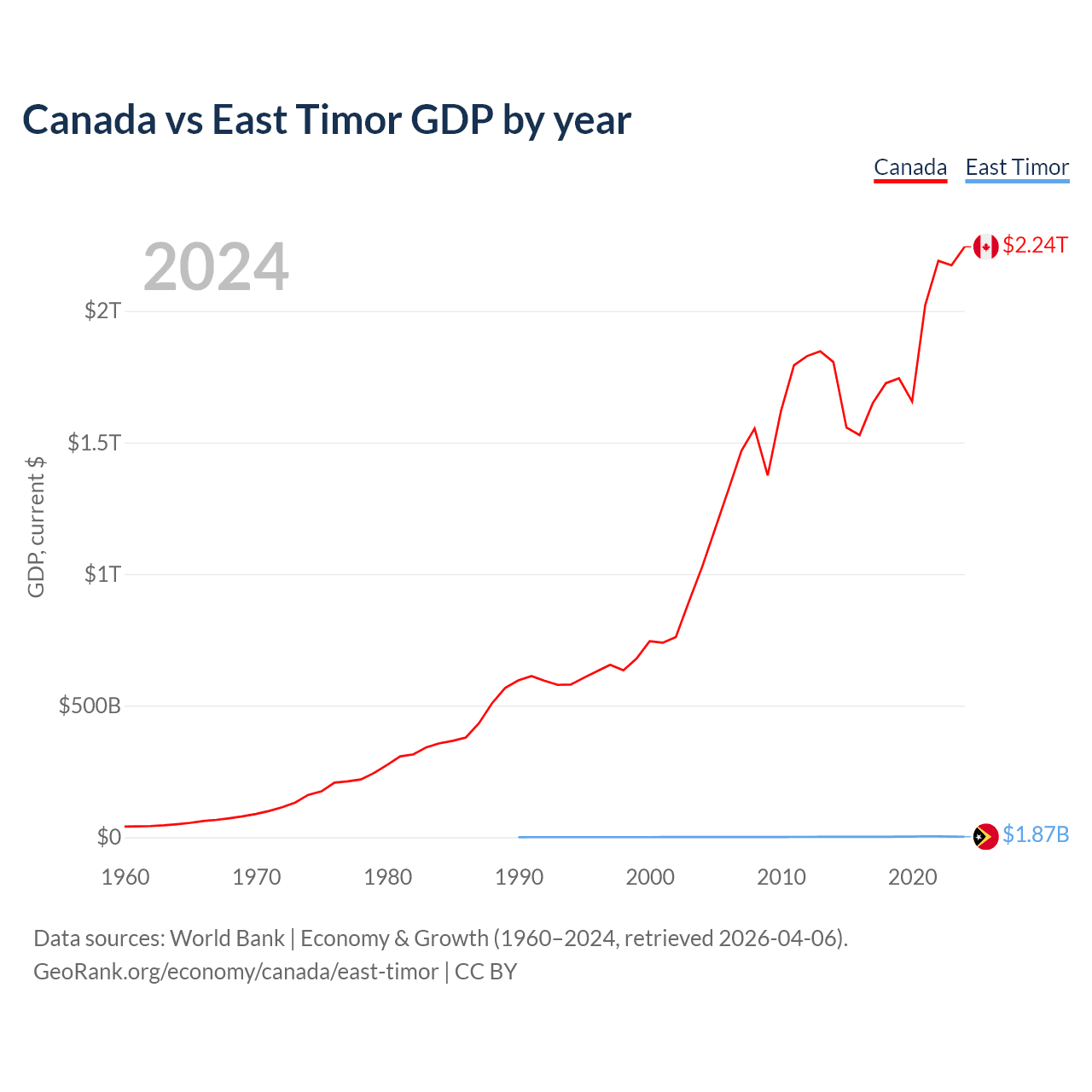 Canada has a GDP of $2.24T compared to $1.87B for East Timor, ranking 9/197 and 181/197 by economy size, respectively.